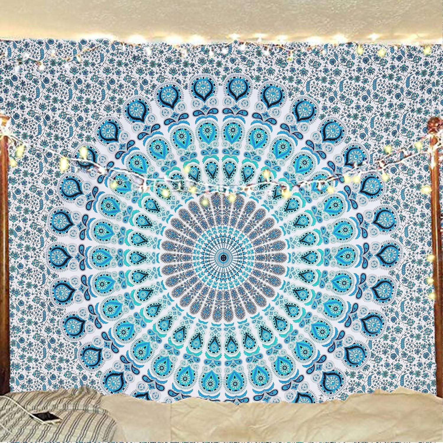 Bless International Handmade Indian hippie Bohemian Psychedelic Peacock Mandala Wall hanging College Dorm Beach Throws Table Cloth Bedding Tapestry (Peacock Sky Blue, Queen(84x90Inches)(215x230Cms))