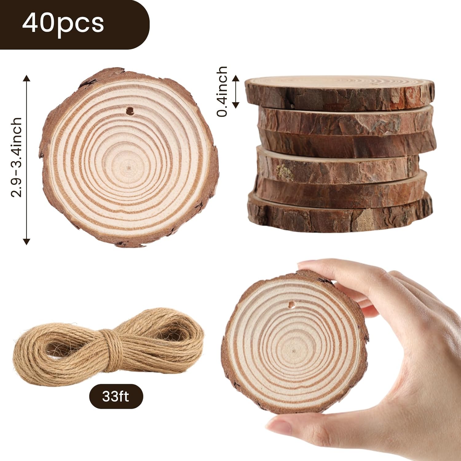 JOHOUSE 40Pcs Wood Slices, 2.9"-3.4" Unfinished Natural Wood Rounds for Crafts, Christmas Ornaments, Home Decor, Painting, Coasters, DIY Gifts, Party Wedding Decor, with Pre-drilled Hole
