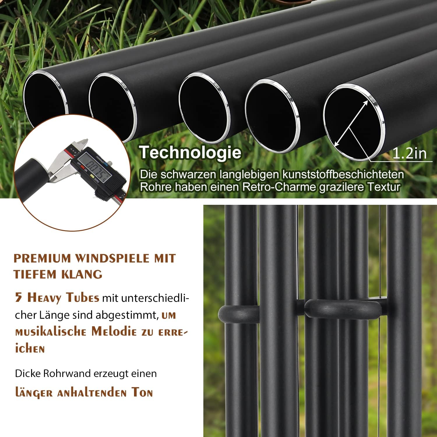 - Wind Chimes Outdoor Large Deep Tone —The Large outdoor wind chimes has 5 Recycled Big Aluminum Tubes with Durable Plastic-Coated Finish. Premium Quality Aluminum and Strong Beech Wood Coated to Resist Water and Wind Damage. This large tube wind chime has a shining black color and 5 super heavy tubes with different length makes a wonderful tone with the breeze easily.