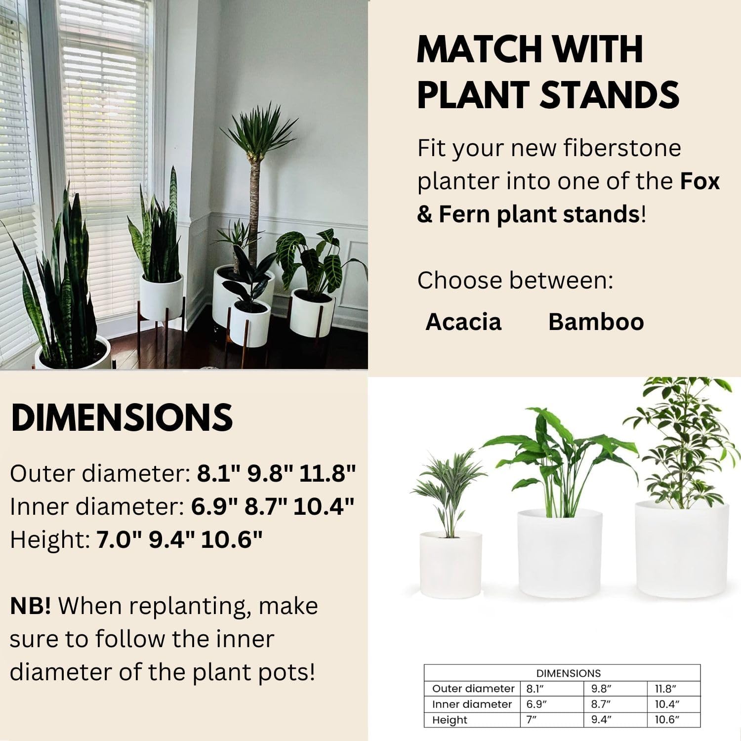 Fox & Fern Matte White Plant Pots with Drainage Plug (Set of 3) — Premium Lightweight Fiberstone 8, 10, and 12 Inch Planters for Indoor and Outdoor Use; Weather Resistant & UV Resistant