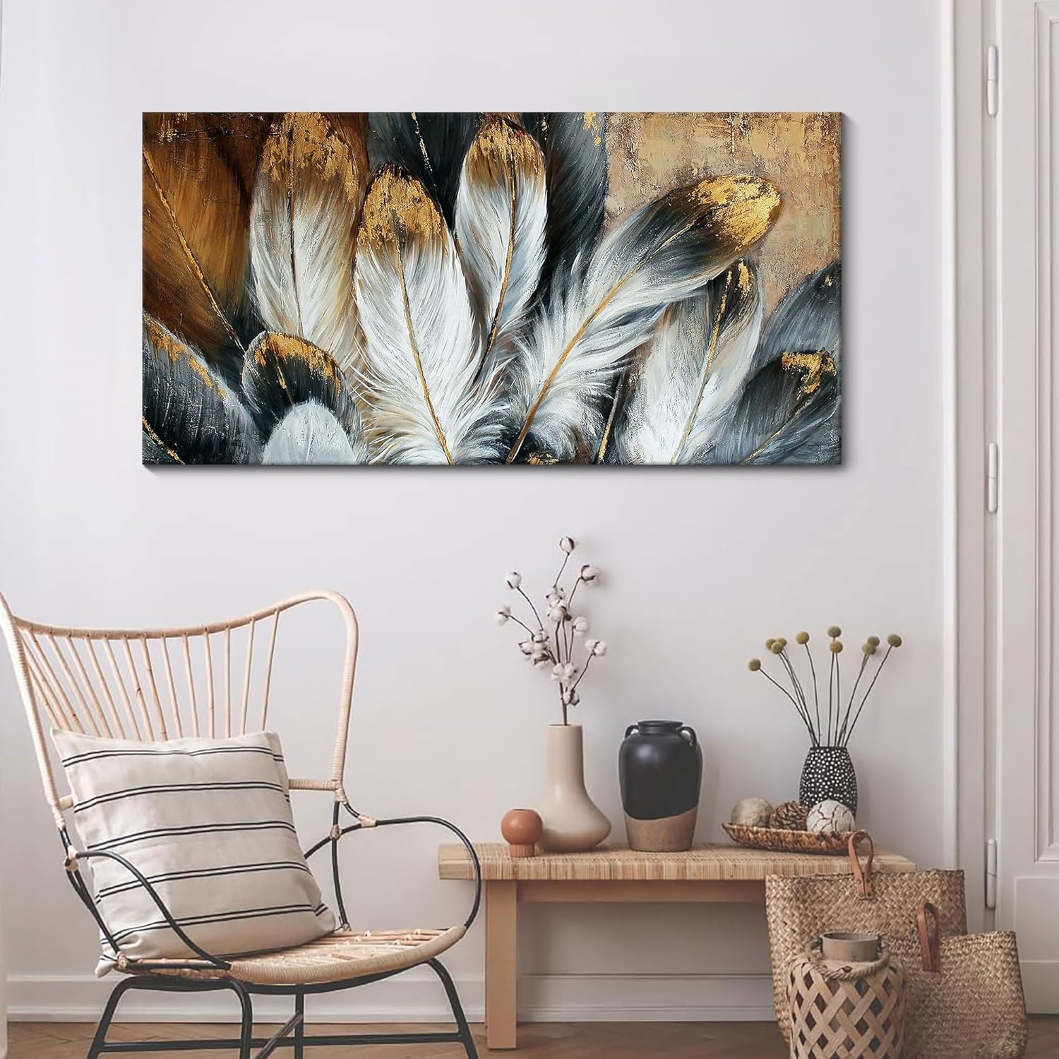- Feather Wall Decor:This feather wall art is not pure hand-painted.It is painted on giclee printed canvas,add some gold foil on the canvas.The colors are the same as the picture show.But due to different monitors the colors may appear slightly different to the picture.