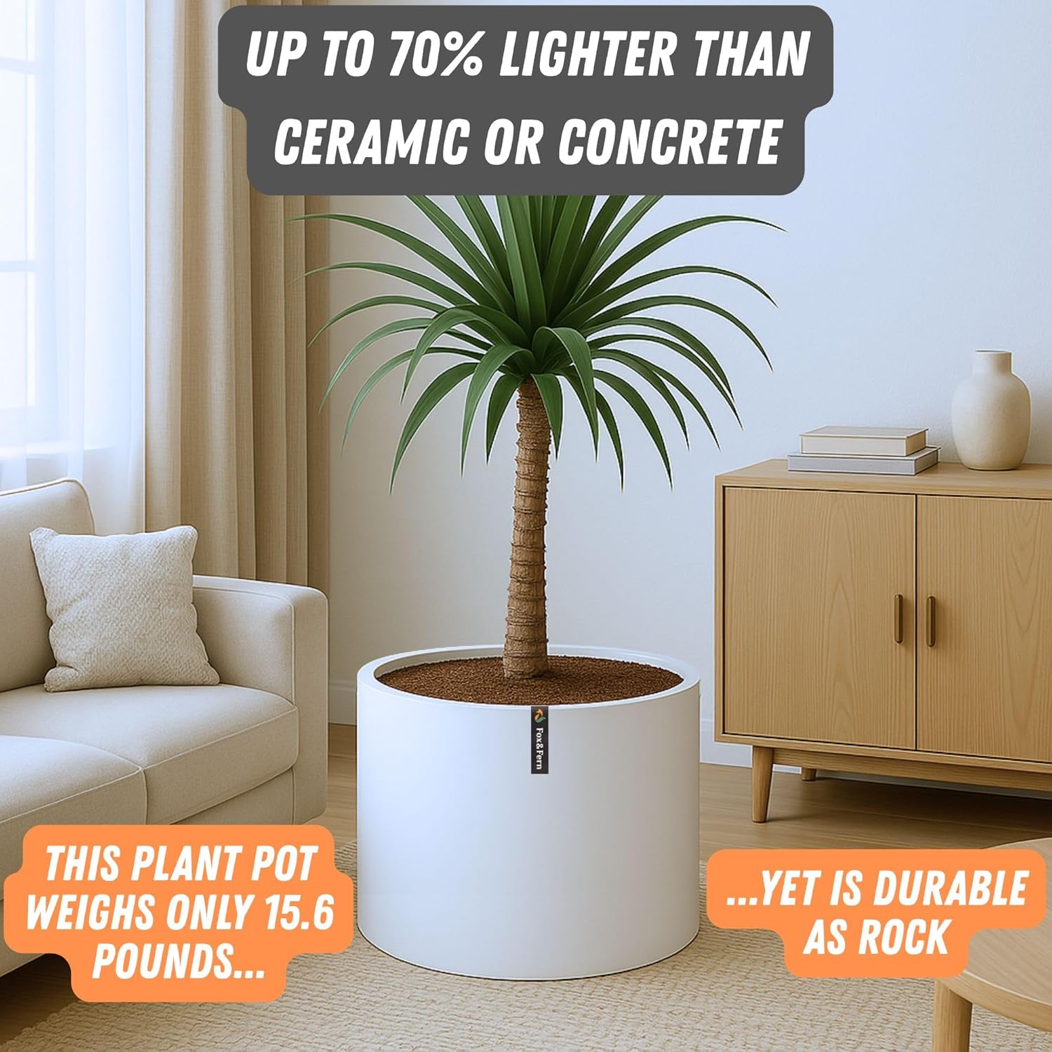 Fox & Fern 18.7 Inch Extra Large Planter — Premium Lightweight Fiberstone Matte White Plant Pot with Drainage Plug; Extra Large Planter for Indoor & Outdoor Use; Weather Resistant & UV Resistant