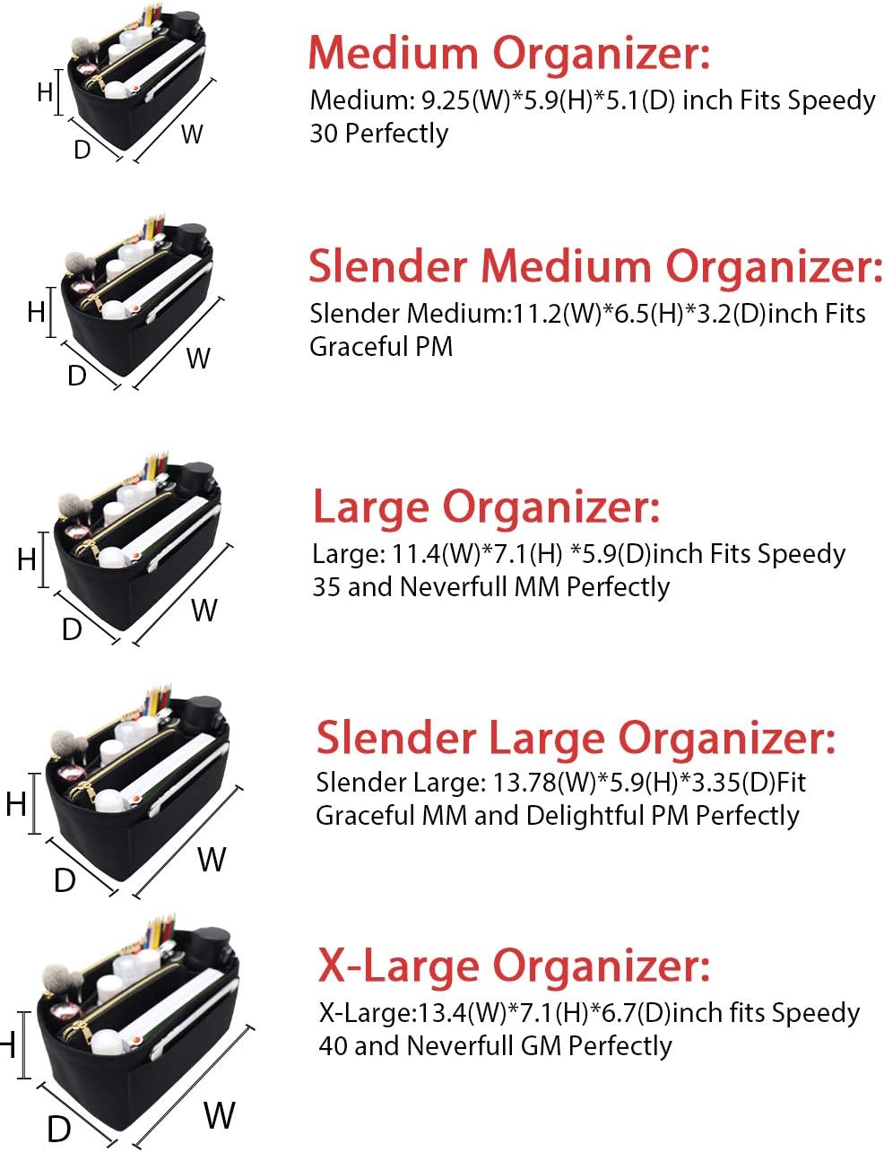 • SIZE OF BAG ORGANIZER: Medium: 9.25(L)*5.9(H)*5.1(W) inch Fits Speedy 30 Perfectly. Slender Medium: 11.2(L)*6.5(H)*3.2(W)inch Fits Graceful PM. Large: 11.4(L)*7.1(H) *5.9(W)inch Fits Speedy 35 and Neverfull MM Perfectly. Slender Large: 13.78(L)*5.9(H)*3.35(W)Fit Graceful MM and Delightful PM Perfectly. X-Large:13.4(L)*7.1(H)*6.7(W)inch fits Speedy 40 and Neverfull GM Perfectly. Portable and Compact Purse Perfectly For any Brand.L*H*W means (Length*Height*Width)