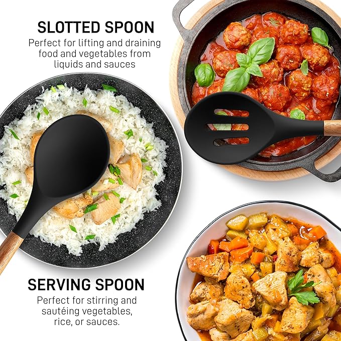 - PREMIUM QUALITY THAT LASTS: These kitchen utensils are made of food-grade silicone with a heat resistance of up to 464°F, making these ideal for stirring food in hot pans. The handles are crafted from authentic acacia hardwood, perfect for long-term use.