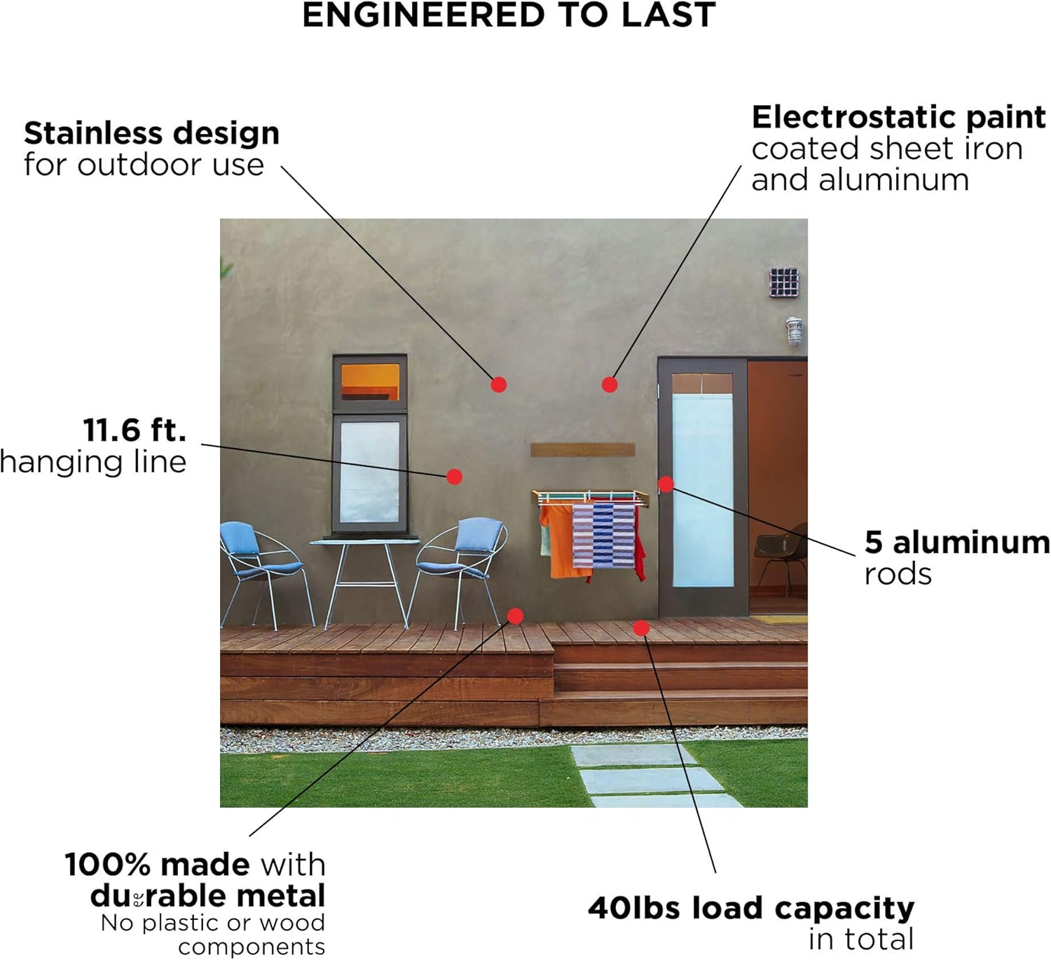 - LARGE DRYING SPACE & HEAVY WEIGHT CAPACITY: Our foldable laundry drying rack features 5 heavy-duty aluminum rods with 11.6 feet of linear hanging line and can hold up to 40 lbs weight.