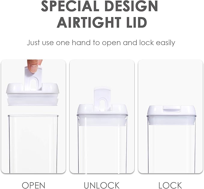 - Air-Tight to keep food dry and fresh----With special sealing mechanism, you can open or close our plastic containers safely by using only two fingers. Simply flip the ring to open or flip the ring down to lock and seal.
