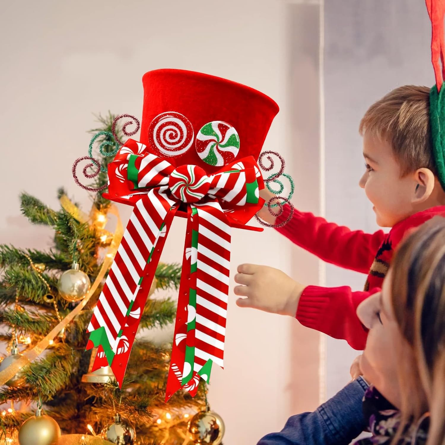 - Christmas Candy Cane Tree Topper: Add a festive touch to your holiday décor with this playful peppermint-inspired top hat! Featuring a red and green candy cane-style bow, streamers, and lollipop trim, this unique red top hat design is perfect for your Christmas tree and home decorations. It also makes a charming gift for candy-themed holiday celebrations.
