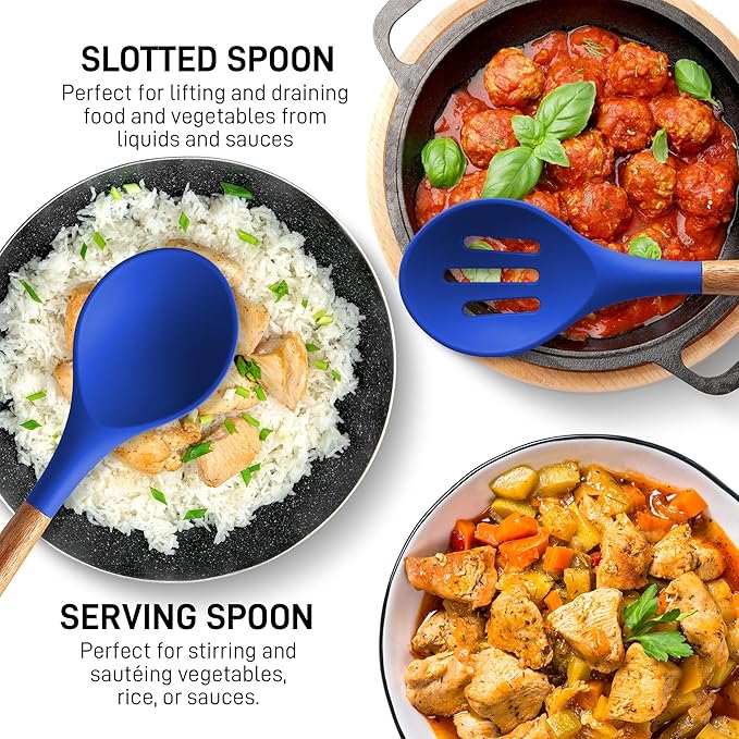 Zulay Kitchen Non-Stick Silicone Cooking Utensils Set with Acacia Wood Handles - 5 Piece Set - Heat Resistant to 464F - Dark Blue