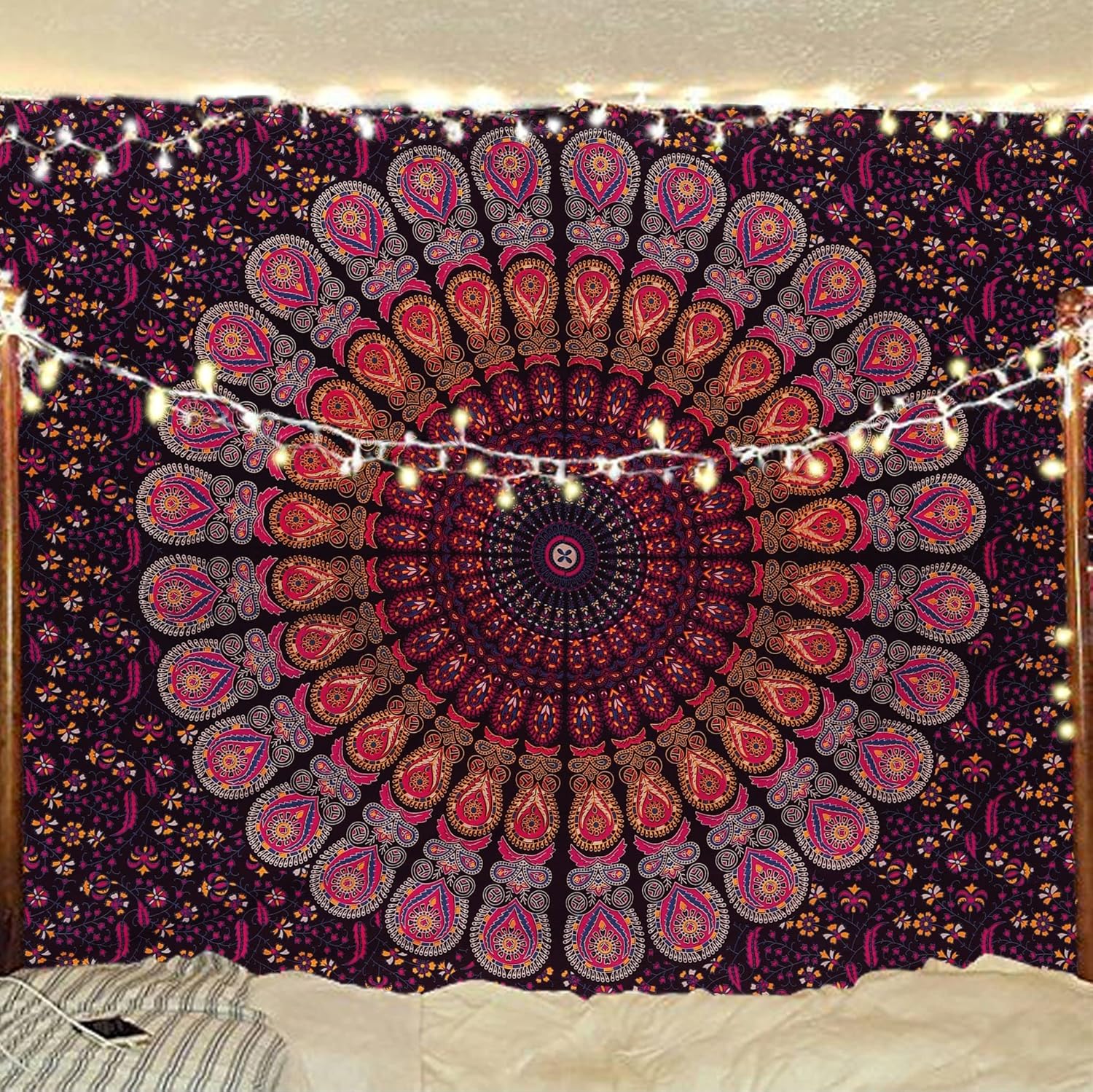 Bless International Handmade Indian hippie Bohemian Psychedelic Peacock Mandala Wall hanging College Dorm Beach Throws Table Cloth Bedding Tapestry (Golden Pink Blue, Twin(54x72Inches)(140x185cms))