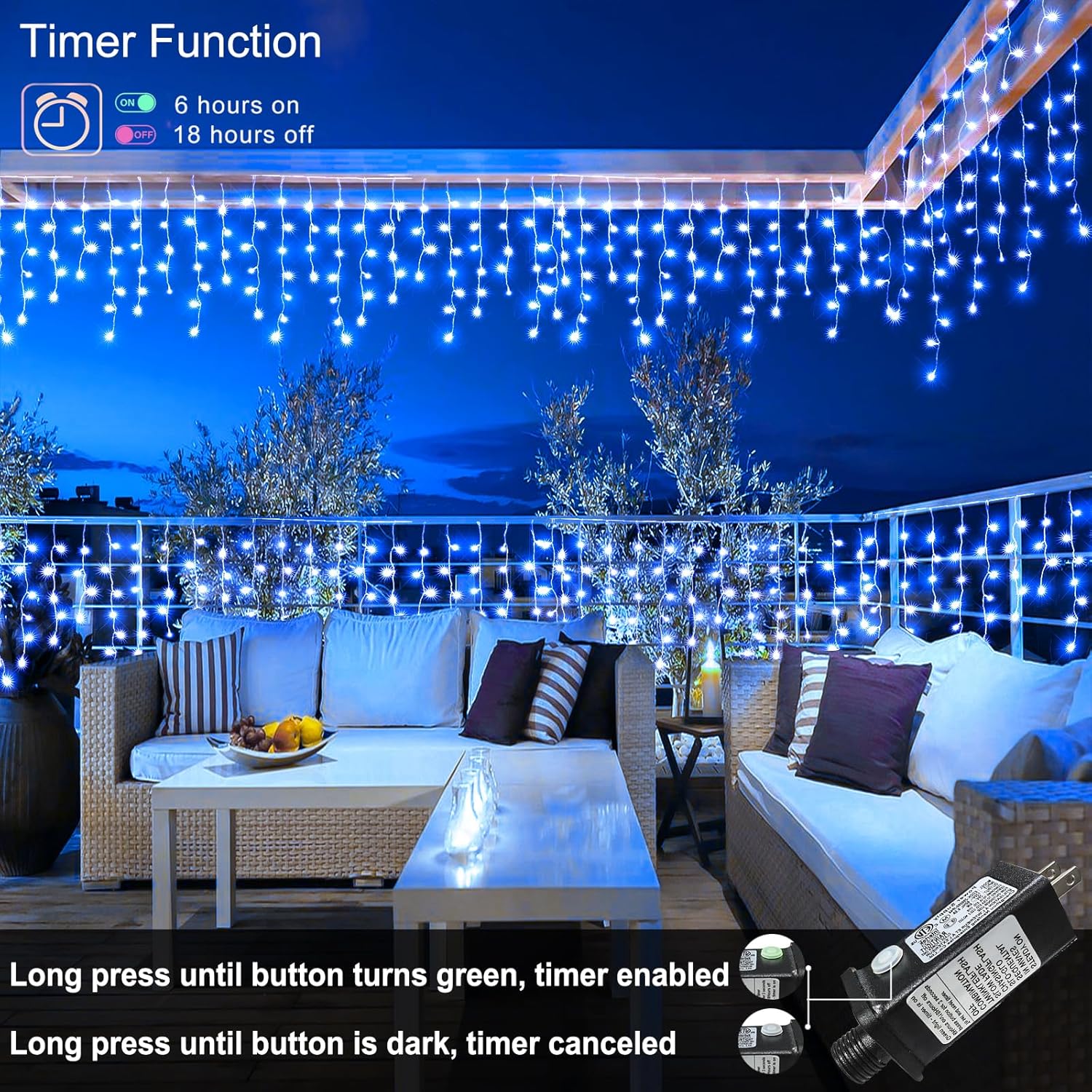- Upgraded 8 Modes Blue Christmas Lights: The icicle lights for outside have 8 selections of light pattern: 1.Combination 2.In Waves 3.Sequential 4.Slo-Glo 5.Chasing/Flash 6.Slow Fade 7.Twinkle/Flash 8.Steady On. Different lighting effects are controlled by the button on the plug. These beautiful and vibrant led christmas lights outdoor will bring you a lot of festive atmosphere.