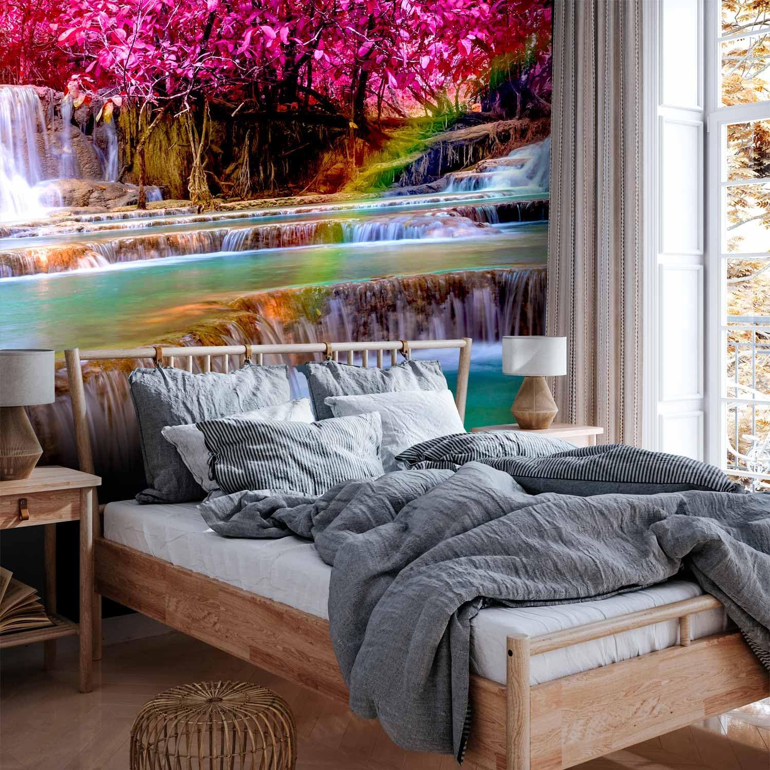 artgeist Wall Mural Waterfall 216x98 in - XXL Non-Woven Corner Wallpaper Fleece Angle Wall Decor Photo Print Picture Image Design Modern Nature Sun Pink Tree Forest c-B-0474-a-a