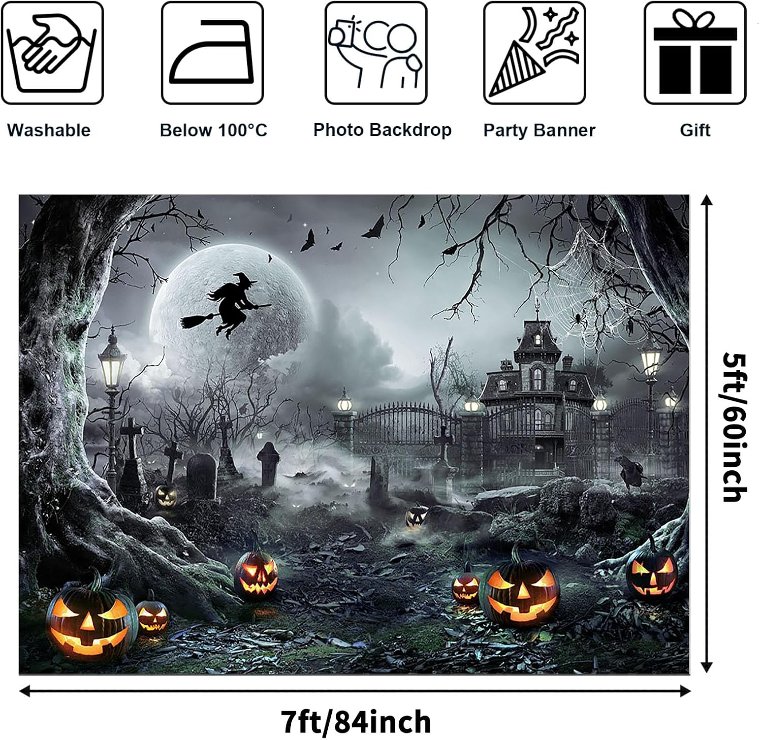 - Proper Size: The Halloween photography backdrop size is 7x5 ft (width: 84 inches, height: 60 inches), foldable for shipping; The size is large enough to be paired with holiday related balloons, garland kit, props, and tablecloths to create a perfect party