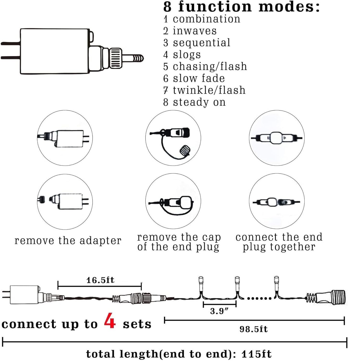 - 8 Modes: Halloween 300 LED string lights with 8 light modes: combination, in waves, sequential, slogs, chasing/flash, slow fade, twinkle/flash, by pressing the button on the plug to change the mode.