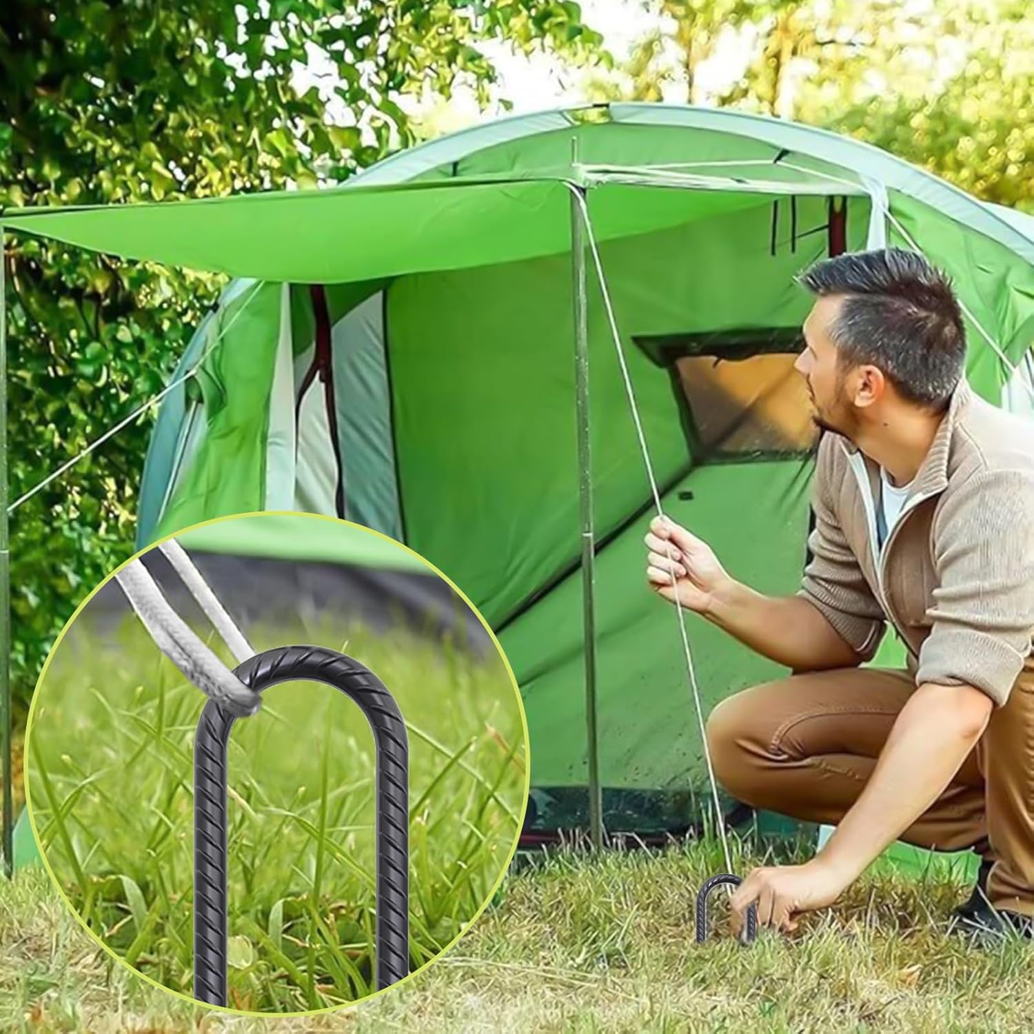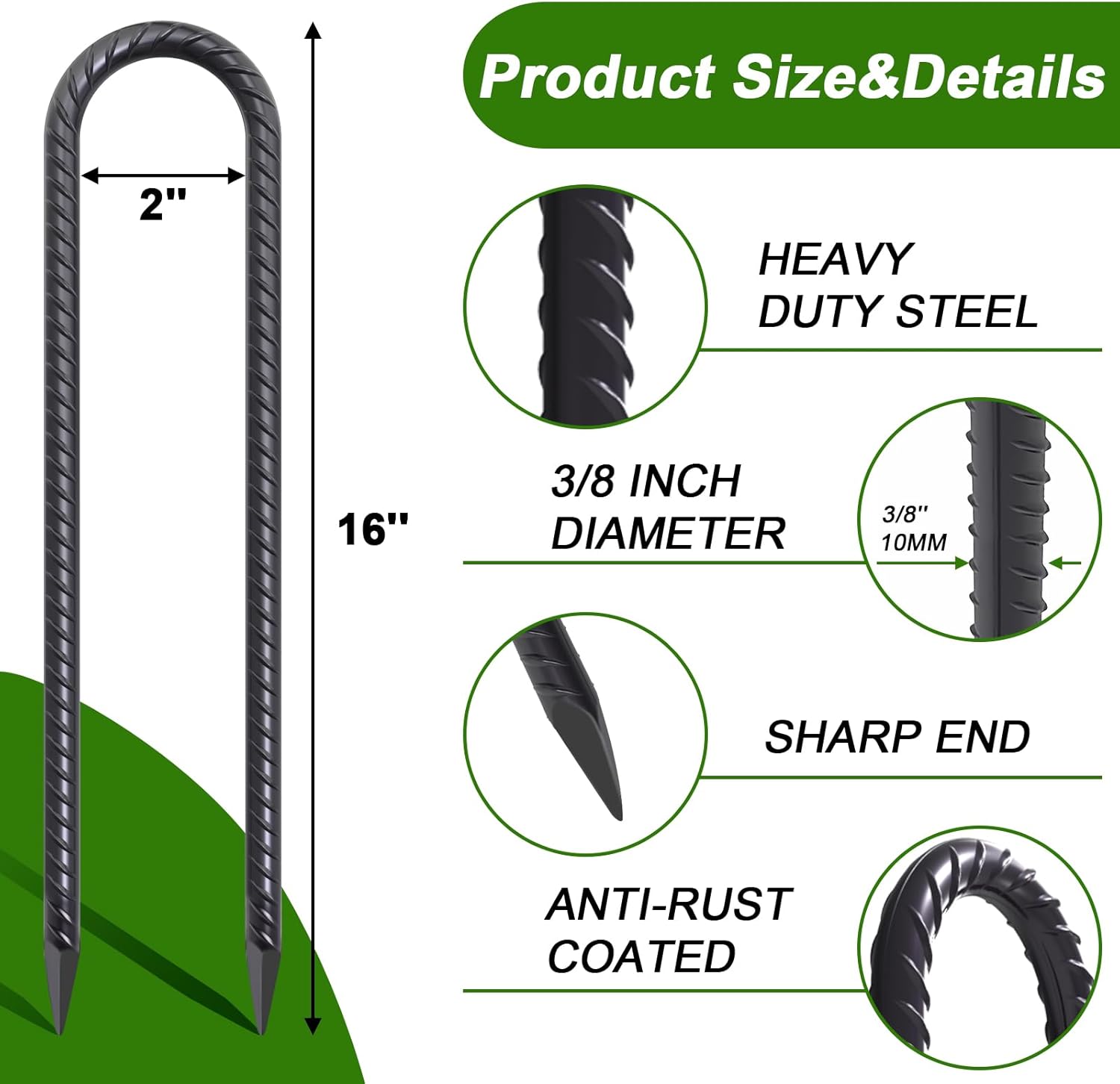 AAGUT 16 Inch 8 Pcs Rebar Trampoline Stakes 3/8" Extra Heavy Duty Metal Steel High Wind Ground Anchors Galvanized U Shaped Hook for Camping Tent Round Chisel Point End Black Powder Coated
