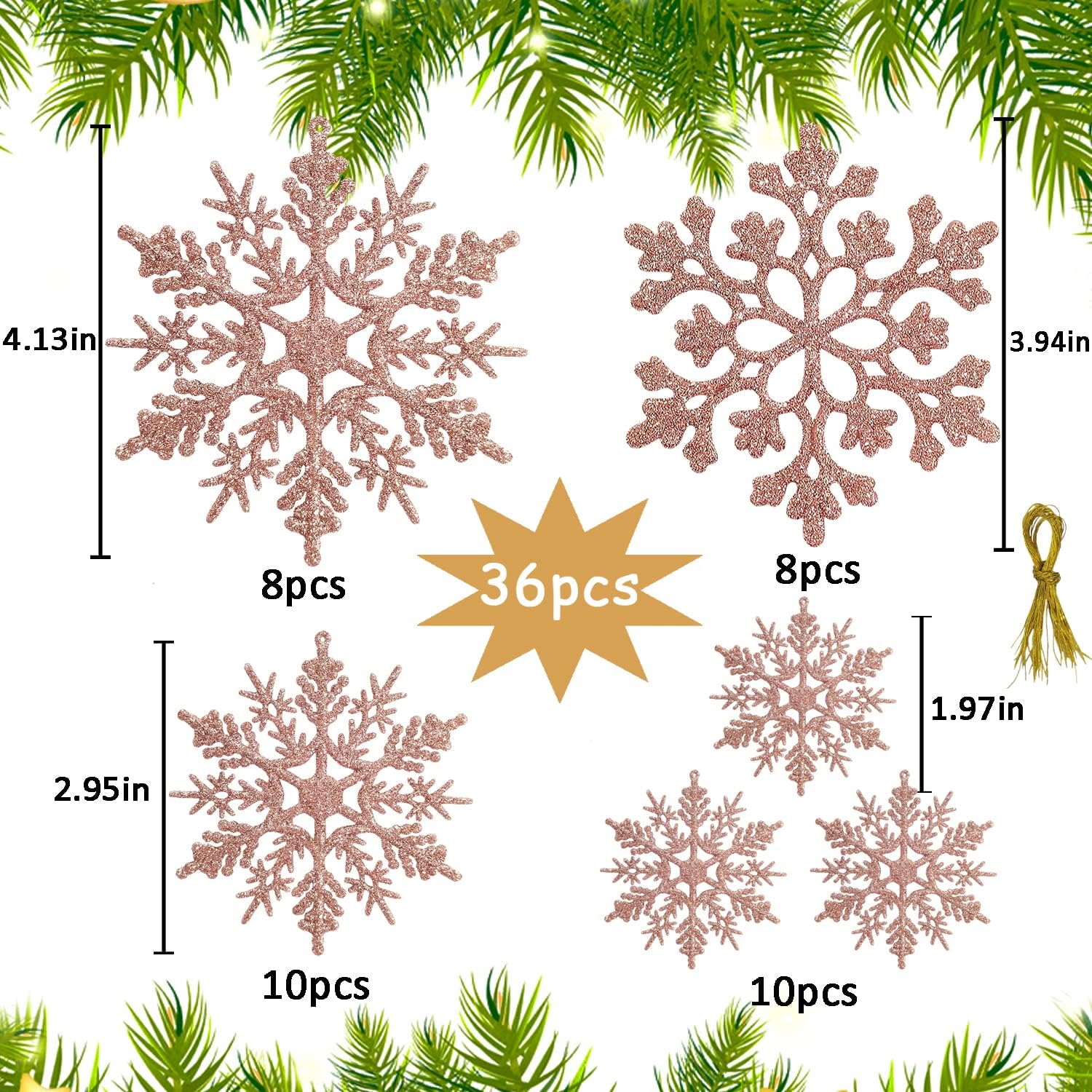 - SNOWFLAKES OF VARIED SIZES: A value pack of 36pcs rose gold Christmas glitter snowflakes in 3 varied sizes and 2 different patterns: 8pcs for 4.2 inch for both styles, 10pcs for 3 inch and 10pcs for 1.8 inch. Itโs a lot of snowflakes sufficient for your Christmas decorations