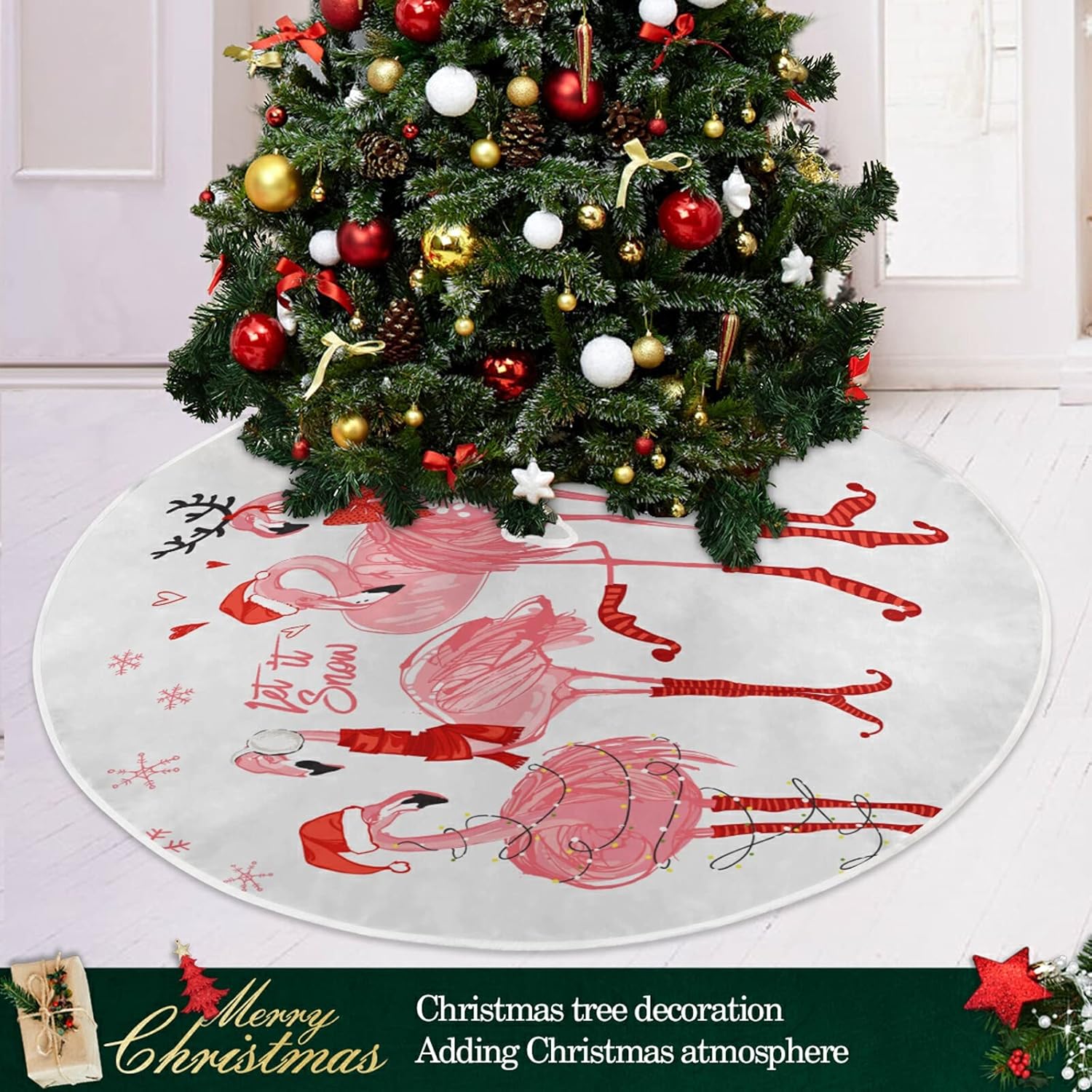 Christmas Pink Flamingo Snowflake Tree Skirt, Seasonal Tree Mat Holiday Party Supplies Ornaments Indoor Outdoor Decorations for Tabletop Trees 35.4 Inches