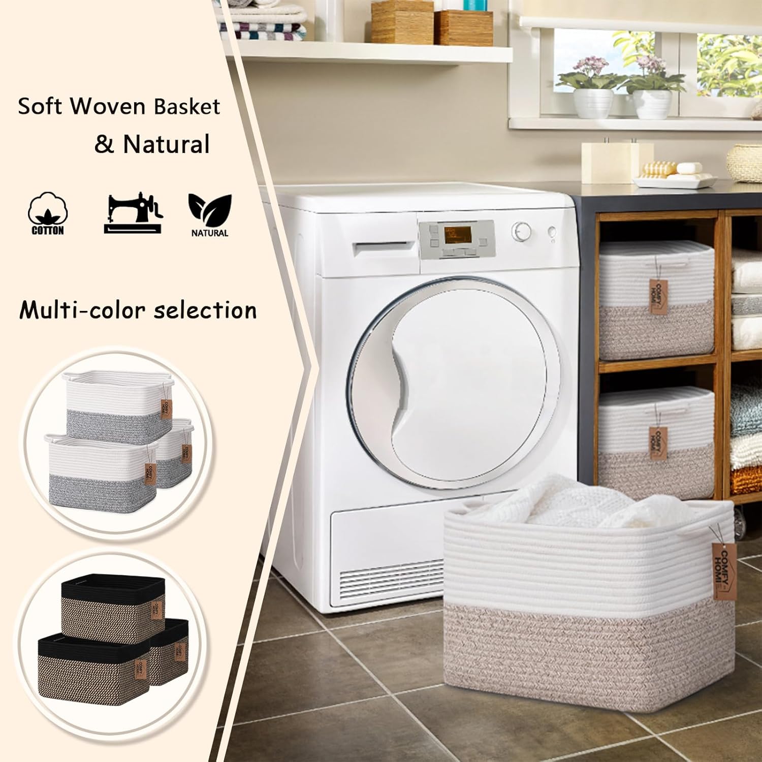 COMFY-HOMI Cotton Rope Woven Basket with Handles for Shelves,Toys,Book, Cloth Storage Baskets for Organizing-13.5" x 11" x 9.5" Toy Decorative Organizer for Living Room, Bathroom (White/Brown)