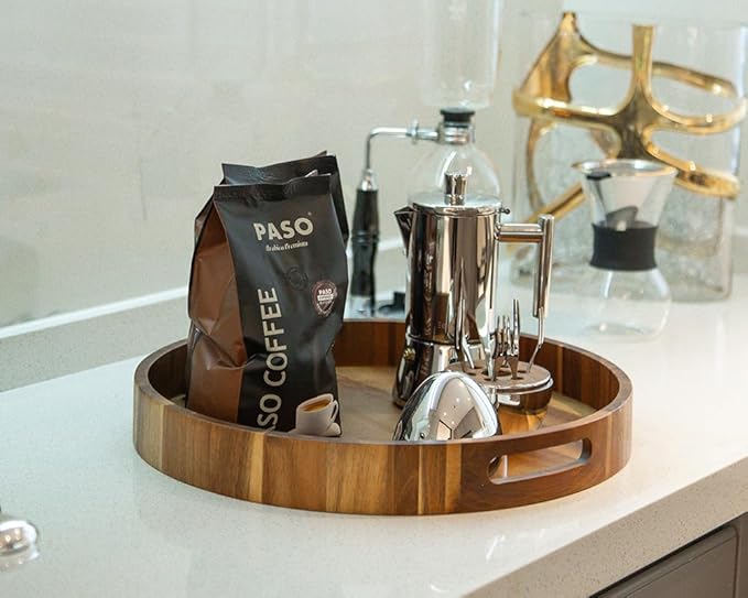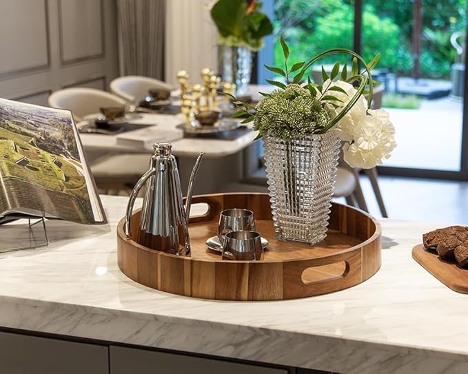 - 【4-COASTERS INCLUDED & RIGHT SPACE】Nested design circular tray(large: 15.75" dia and medium 13.78" dia), there is ample space to store various items. Plus, carrying multiple items from the kitchen to the living room is a breeze. Keep your countertops dry and eliminate dreaded drink ring stains with the four gorgeous rustic wooden coasters.