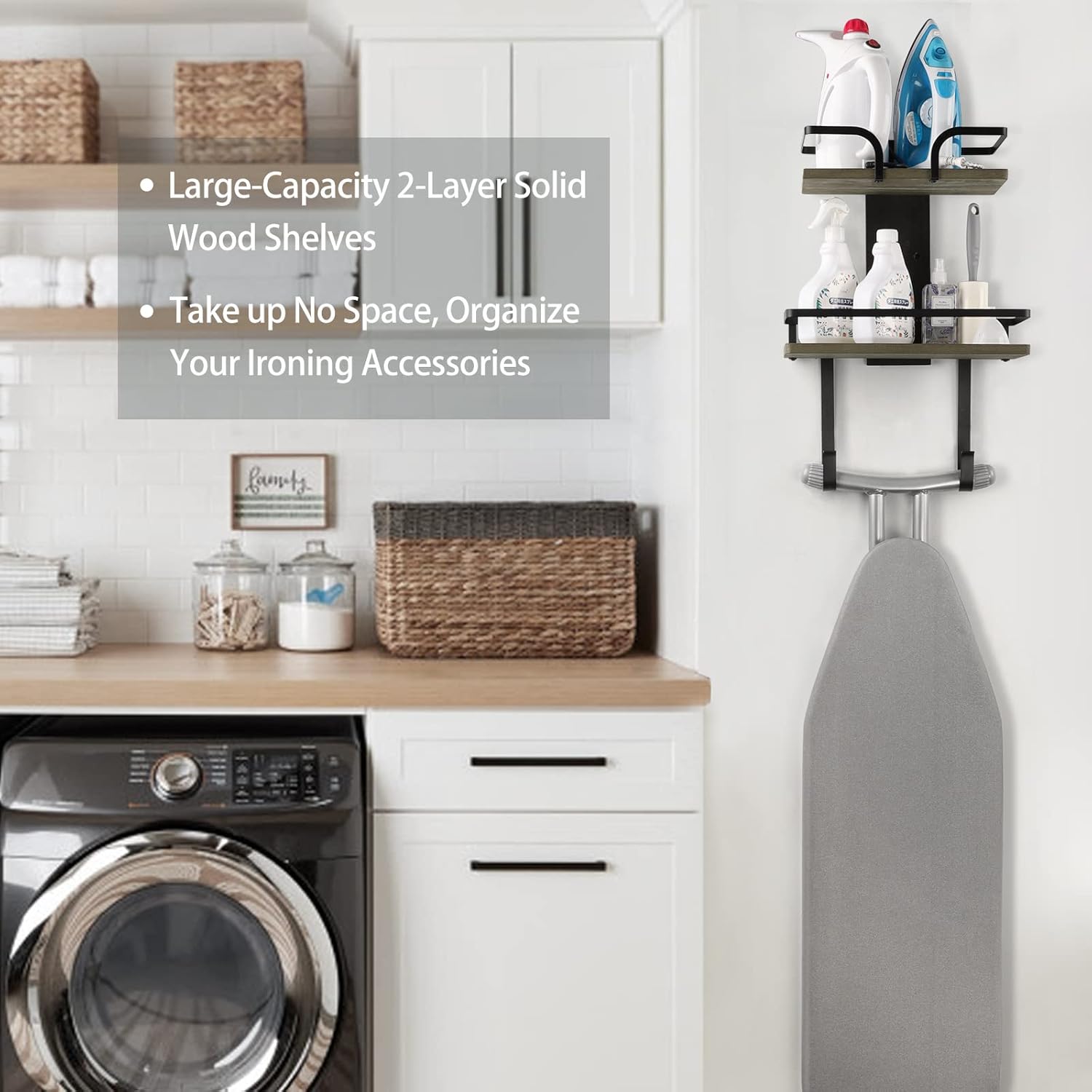 - 【Laundry Room Must-have】Seamless construction of natural rustic wood and metal is both aesthetically pleasing and durable, serving as a safe haven for your ironing board and irons. There is no more complaint about ironing board spoiling your house’ s decoration.