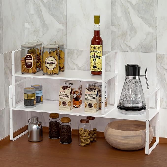 - 【Multifunctional storage】--This shelf will double your space! It can be used in various places in your home, including kitchen cabinets, desks, pantry, bathroom cabinets, closets, countertops, under the sink or any place that needs extra space to maximize storage and organization.