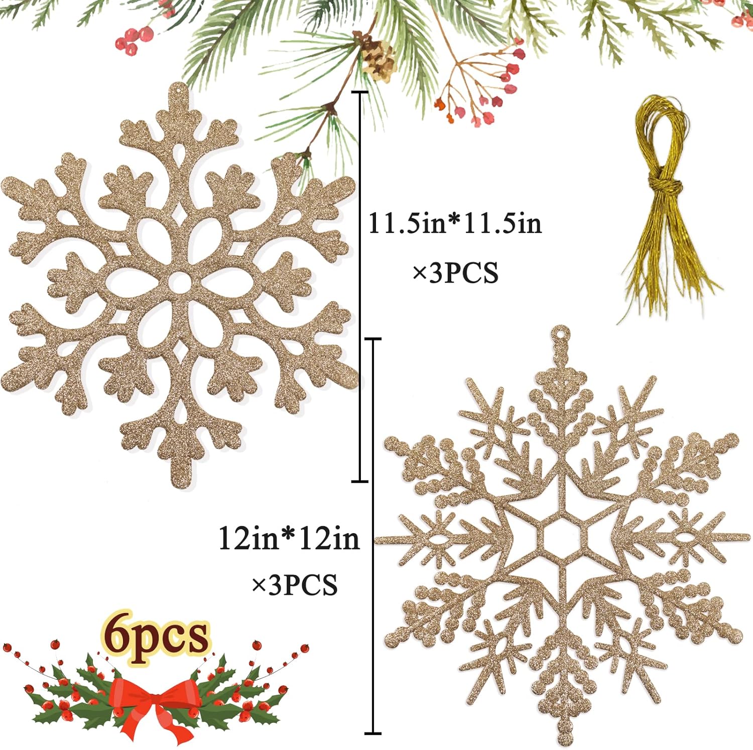 - LARGE SNOWFLAKES: Pack of 6pcs big champagne gold snowflakes in two different styles, both measure about 12” in height, large size snowflakes ornaments great for both indoor and outdoor winter Christmas decorations