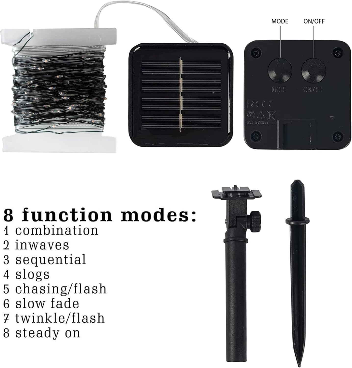 - 8 Lighting Modes: Gorgeous 8 lighting modes including combination, in wave, sequential, slo-glo, chasing/flash, slow fade, twinkle/flash, and steady on. Press the MODE button on the solar panel till the mode you like.