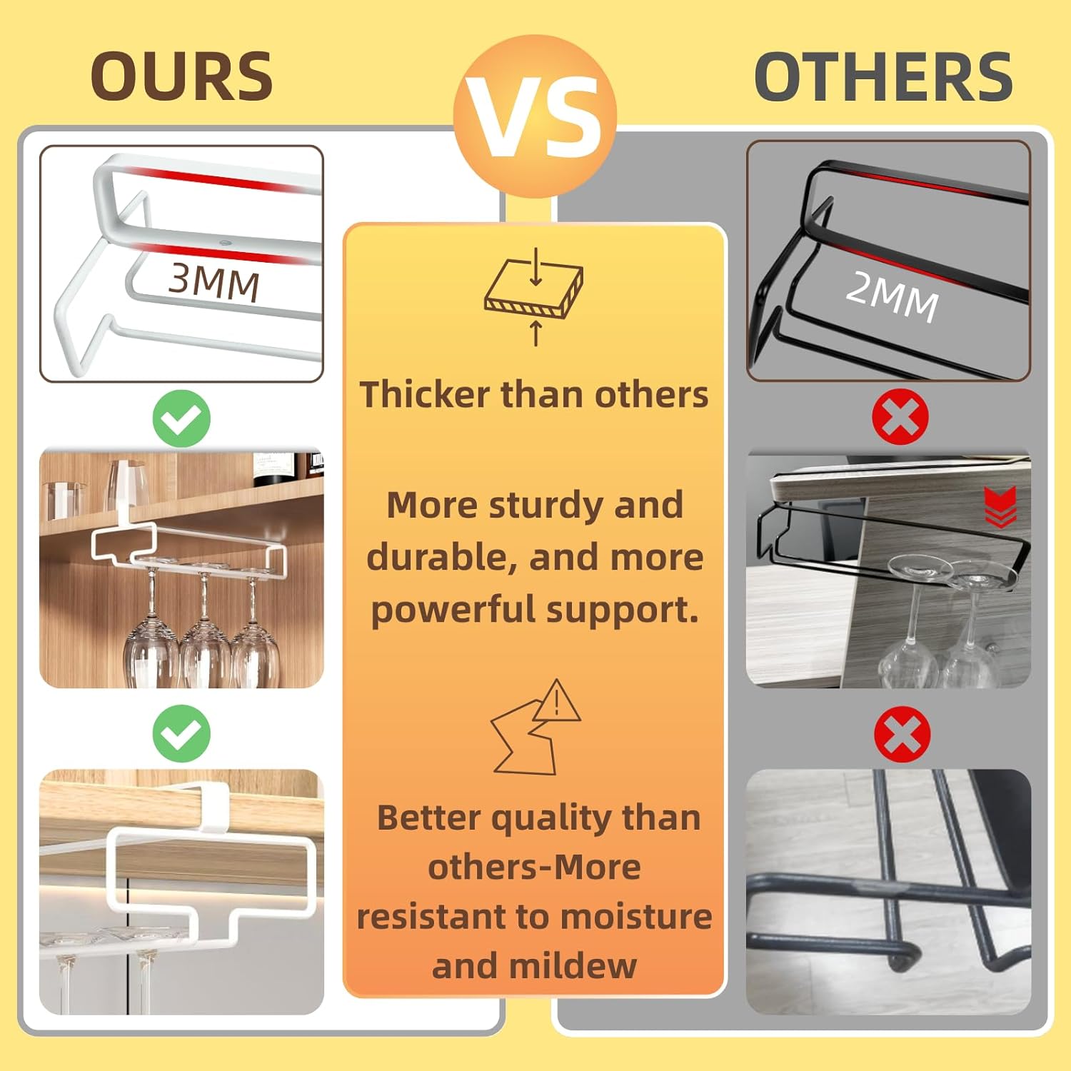 - Space Saving & Easy Access:this under-cabinet wire glass hanging storage rack ensures you have more space inside the kitchen cabinet,partition board, wine cabinet,and it makes your wine glasses well displayed and easy access.Suitable for any shelves with 1inch thickness or less.Please Measure The Thickness Of The Board Of The Shelf Or Cabinet Before Purchase