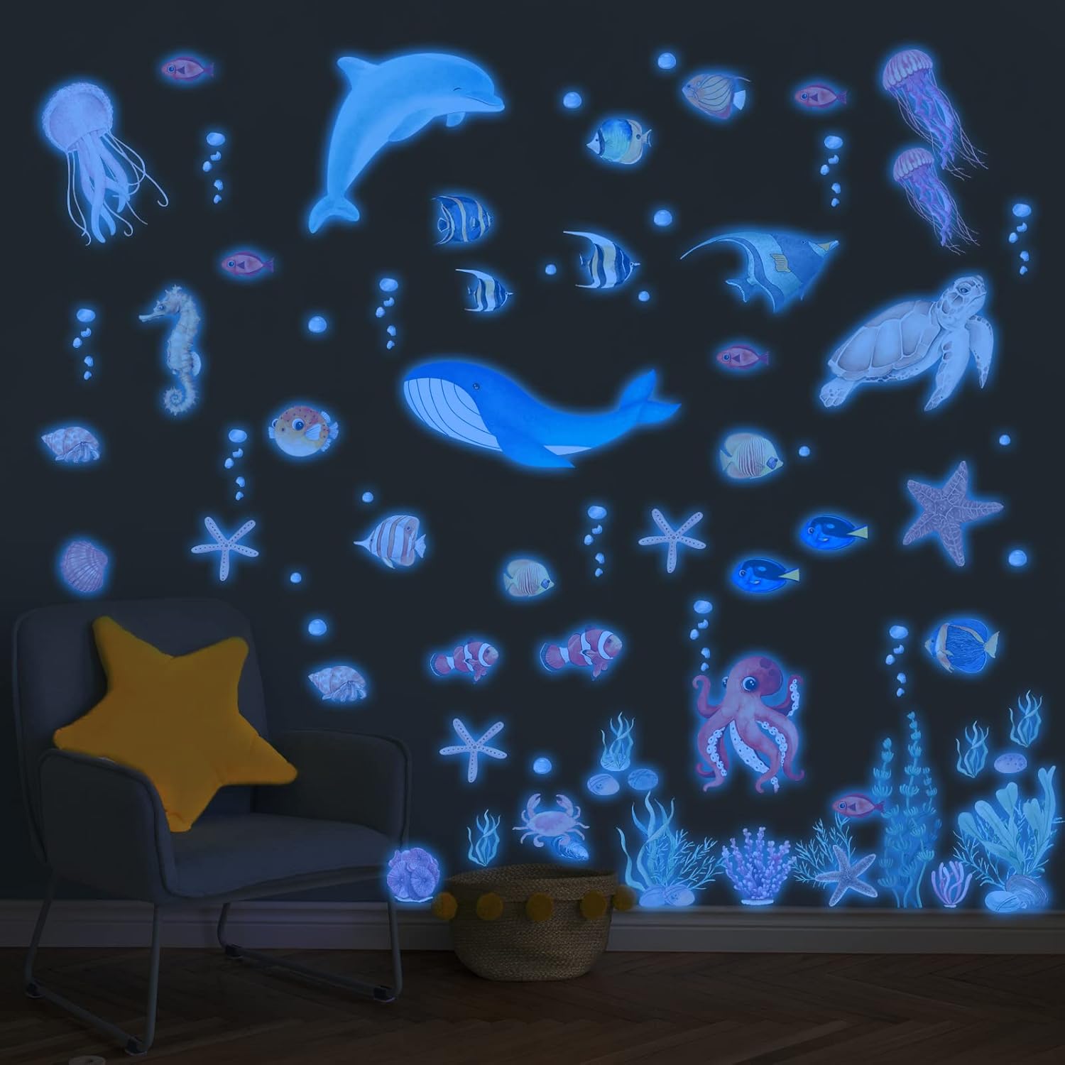 Sea Turtle Ocean Fish Wall Decals Glow in The Dark, Under The Sea Life Animals Stickers for Ceiling, Girls Boys Waterproof Decoration for Living Room Wall Bathroom Toilet