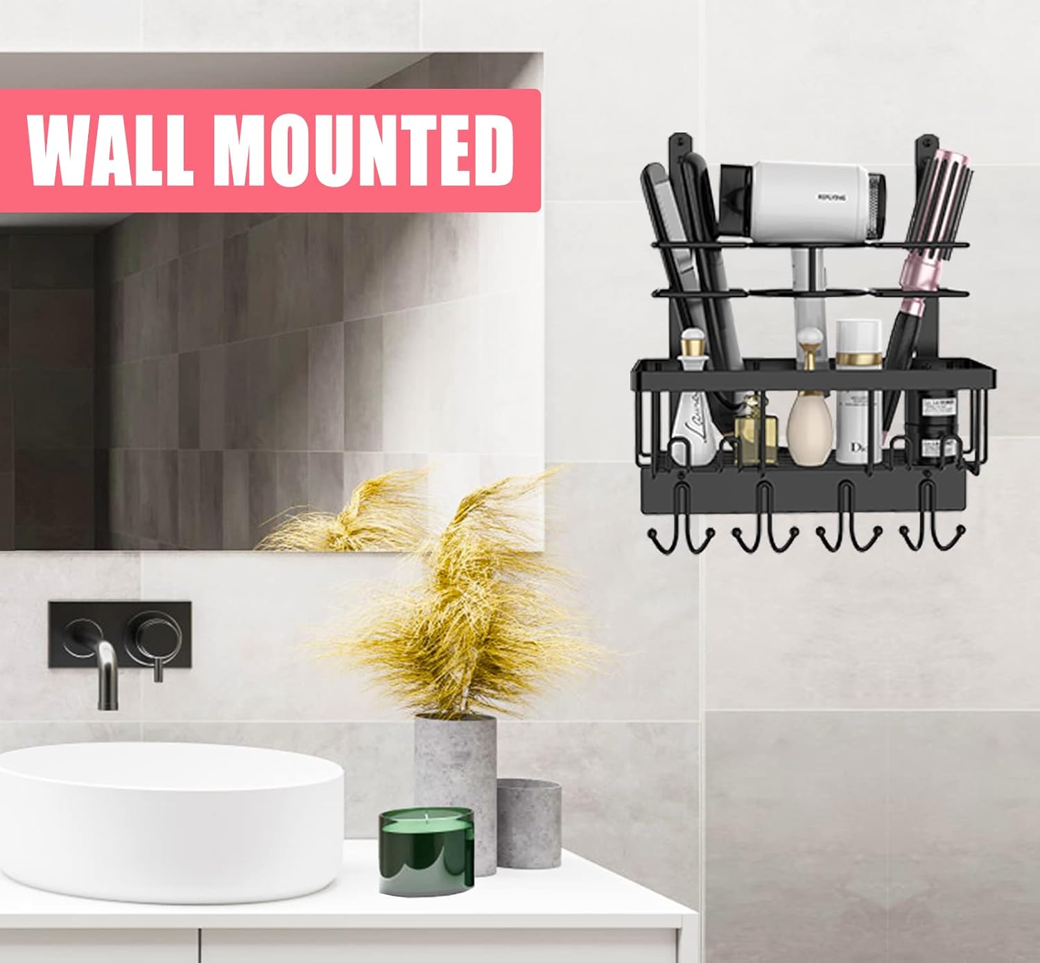 - SPACE SAVING : 3 compartments provide the perfect solution to store your hairdryer, curling iron, flat iron, combs, and brushes. A large basket helps to collect your other styling tools or bath supplies.8 hooks below can as towel hook and coats hook. Get rid of the clutter on the countertops!