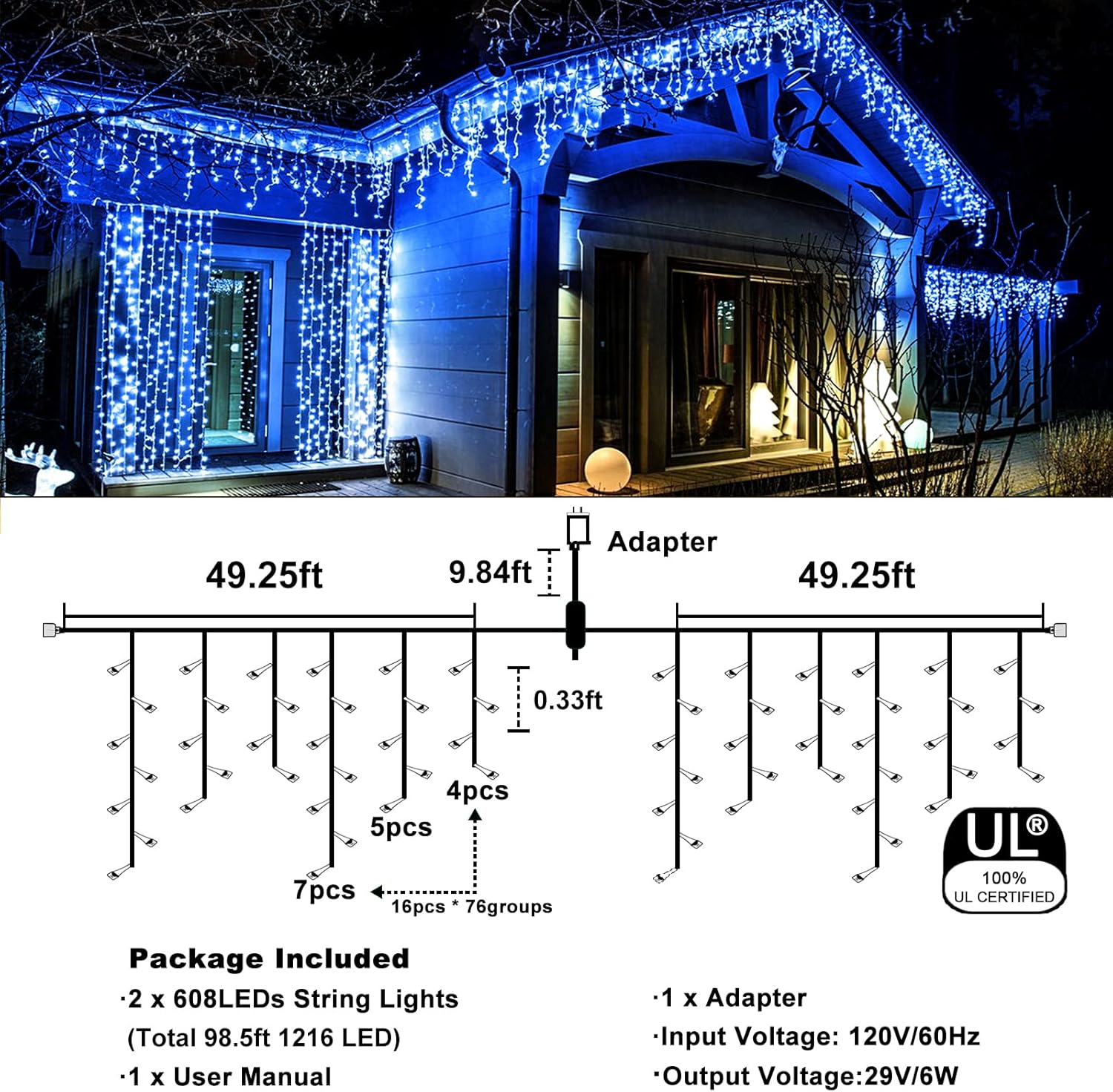 98FT Blue Icicle Lights for Outside, 1216 LED Icicle Christmas Lights with 8 Modes 228 Drops, Curtain Twinkle Lights for Indoor Outdoor Bedroom House Holiday Party Wedding Decorations