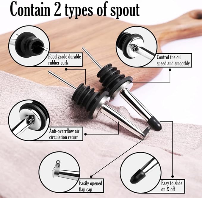 - Two Controlled Pouring Spouts - 18/8 Stainless steel pour spouts with sealed cap or flap cap, fit the bottle well and keep dust out. The pouring fluid is smooth without sticking and can easily dispense the right amount of oil for a healthy diet.