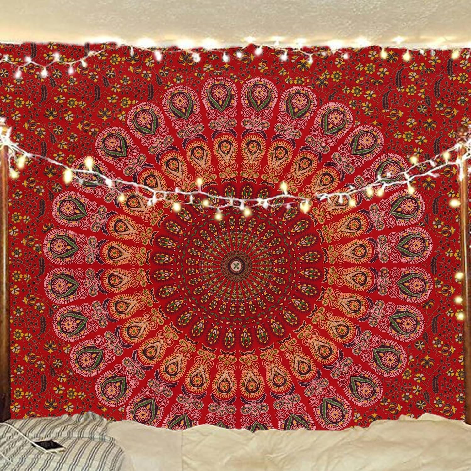 Bless International Handmade Indian hippie Bohemian Psychedelic Peacock Mandala Wall hanging College Dorm Beach Throws Table Cloth Bedding Tapestry (Golden Red, Medium(54x60Inches)(137x152cms))