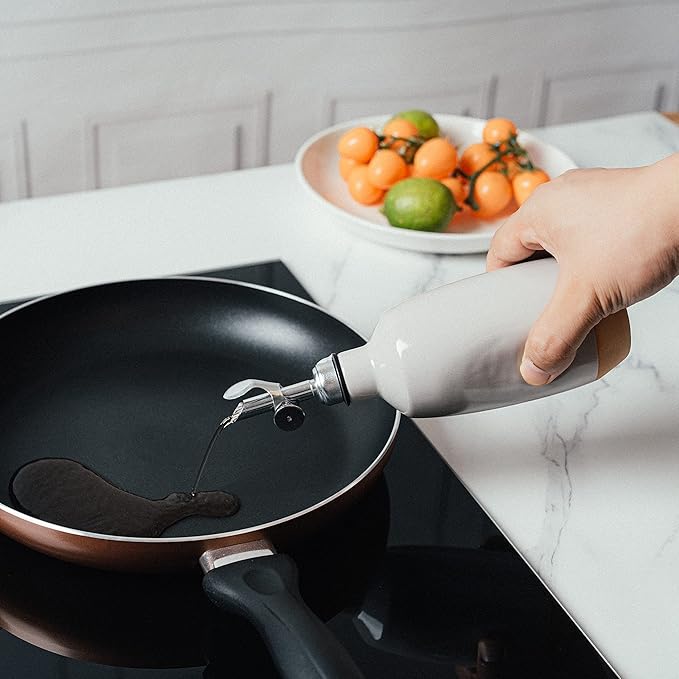 - This ceramic dispenser is perfect for oil and vinegar lovers! This drizzling vinegar and oil cruet is an original piece of pottery handmade by Gute. This handmade ceramic olive oil and balsamic vinegar pot is as practical as it is attractive. The drip-free spout and lid offers a generous flow of your favorite dressing without over pouring, while the deep reservoir can hold enough to last you a generous time between re-fillings. A staple kitchenware item.