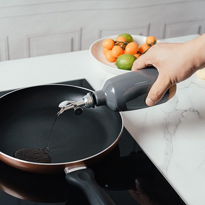 - This ceramic dispenser is perfect for oil and vinegar lovers! This drizzling vinegar and oil cruet is an original piece of pottery handmade by Gute. This handmade ceramic olive oil and balsamic vinegar pot is as practical as it is attractive. The drip-free spout and lid offers a generous flow of your favorite dressing without over pouring, while the deep reservoir can hold enough to last you a generous time between re-fillings. A staple kitchenware item.
