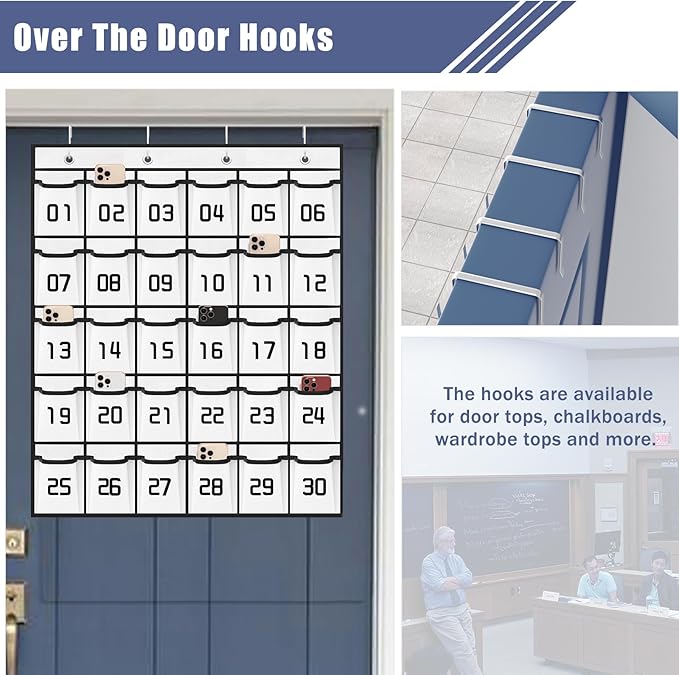 - 【4 Metal Hooks for Classroom Pocket Chart】 Calculator Phone pouch fit the top of whiteboard or over the door as thick as 1.3"-2", hanging organizer with pockets supports the weight of 30 phones (about 20 lb), easy to install and close the door.
