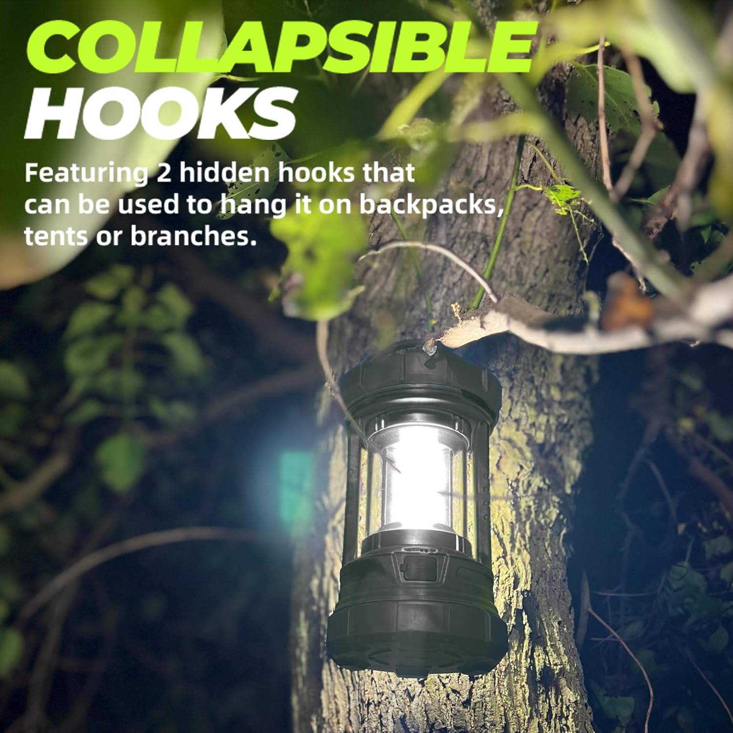 - Collapsible Hooks & Portable Design: Weighing just 1.21lb and measuring a compact 7.09 x 4.13 x 4.13 in, camping lights epitomize portability. Designed for adventurers who prioritize lightweight gear, it slips effortlessly into any backpack, ensuring you're never burdened by bulky gear. Additionally, the lanterns for tent camping feature two hidden hooks that can be used to hang it on backpacks, tents or branches, allowing you to be hands-free during cold weather or any outdoor activity.