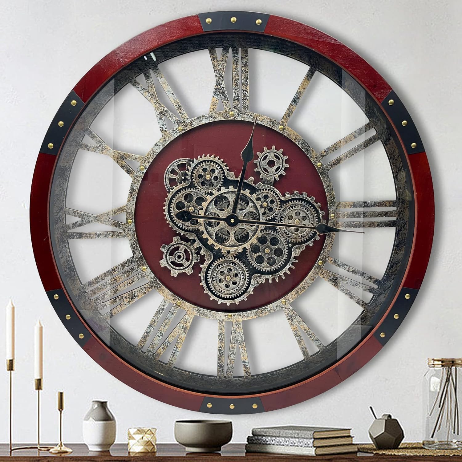 DORBOKER 30" Original Moving Gears Wall Clock, Large Industrial Wall Clock for Living Room Decor, Retro Wood Vintage Farmhouse Steampunk Rustic Clocks for Wall Decor,Red Walnut Wood