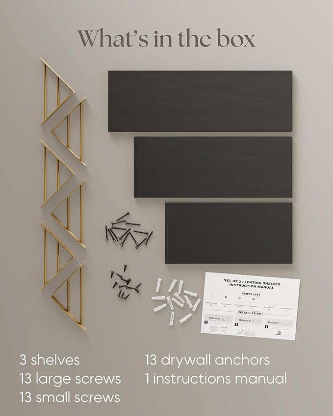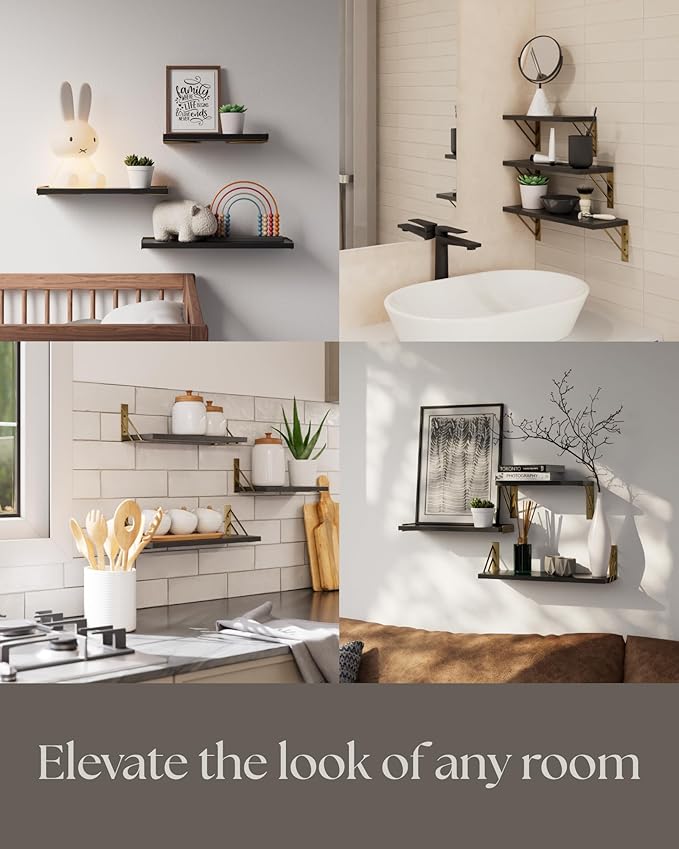 - Three floating shelves made of solid Paulownia wood and metal brackets allow flexible layout and decor options for any room