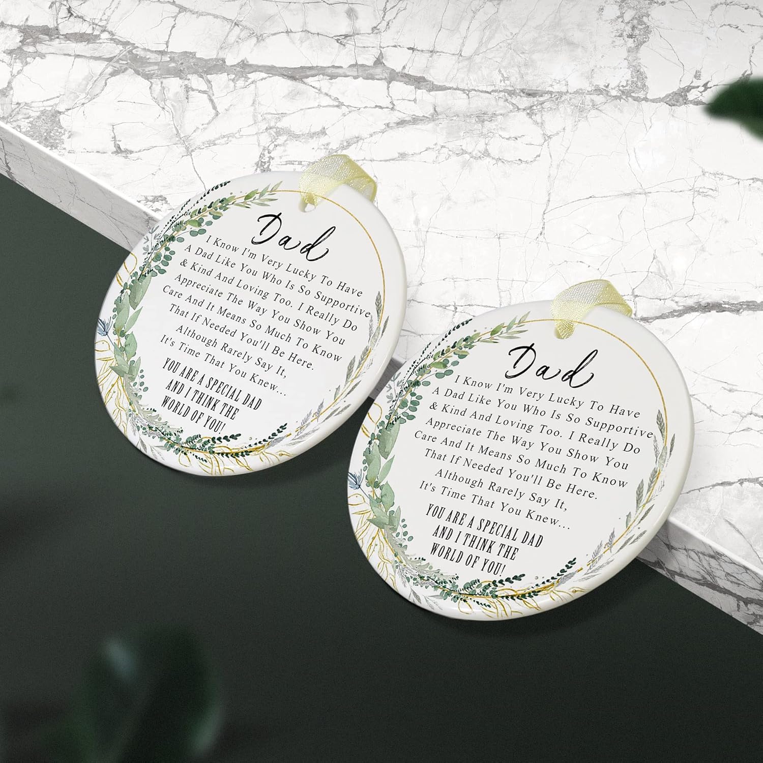 • 🌼【Perfect and delicate size】This is a father memory ornament with a diameter of 2.9 inches and a thickness of only 0.18 inches. The product includes: a round father ornamentt*1, a gift box*1 and a lanyard*1. The gift box comes with it makes it easy for you to give the best dad ever gifts directly to family and friends and other special people in your life, and the lanyard that comes with it helps to hang it easily on the Christmas tree or anywhere you want.