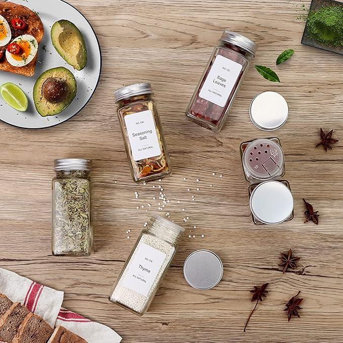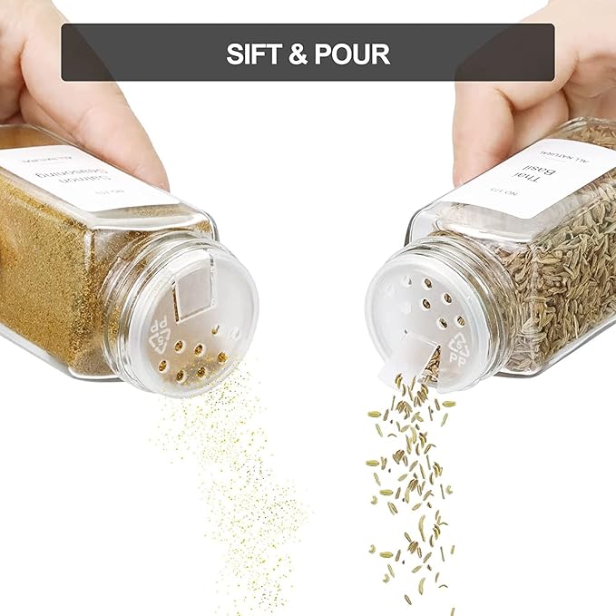- 20 Glass Premium Spice Jars: Spice jars are made of lead-free glass,safe and shatter-resistance.20 dual functioning sift and pour lids; let you shake or use spoons to measure. The airtight aluminum caps protect prepared spices not exposed to air, keeping spices aromatic and flavorful.