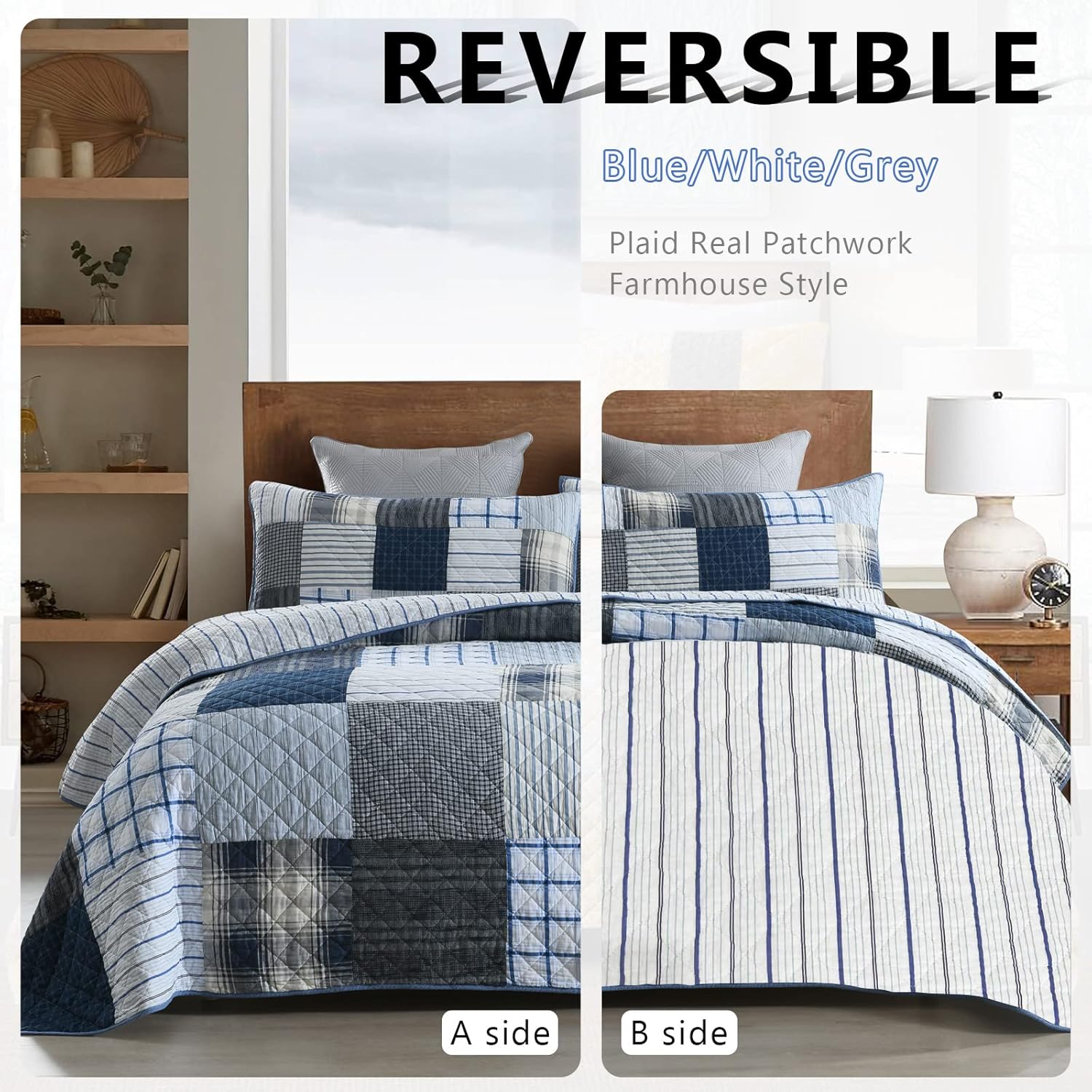 - UNIQUE DESIGN: The king real patchwork quilt set is made of different patterns pieces sewn together. It is reversible. Its A side is designed with grid patchwork and its B side with classic strips. The modern and special design fits for any home decoration brightening your room. It is the best gift choice for your families and friends.