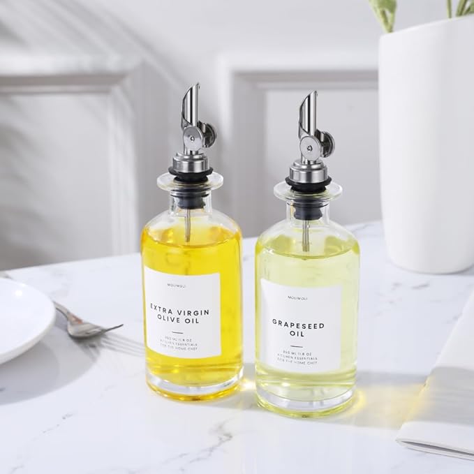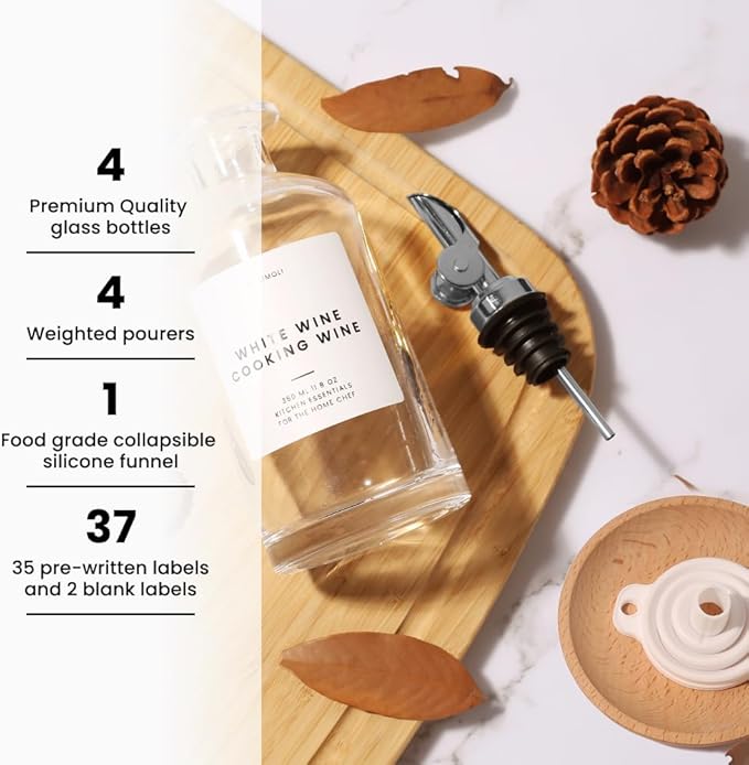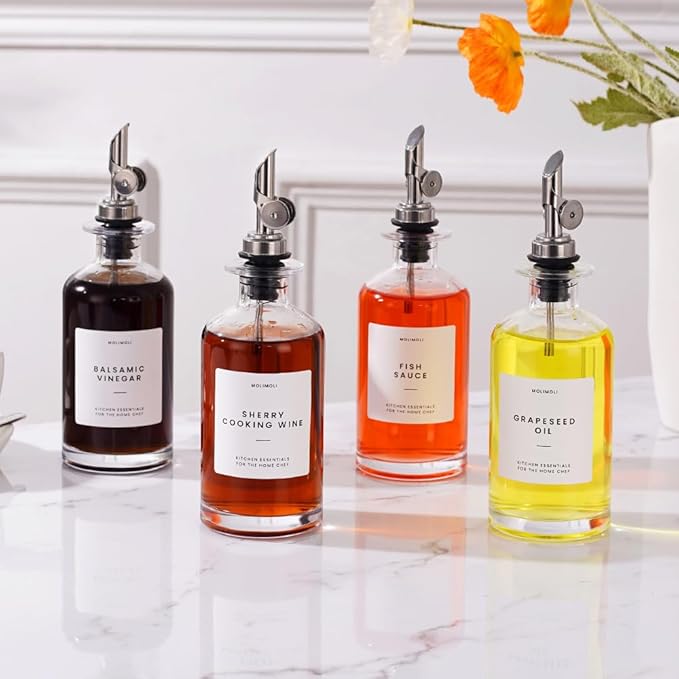 - Modern Kitchen Essential: Minimalism Inspired Cooking Oil Dispenser Bottle. This Set Includes Four High-quality 11.8 Oz (350 Ml) Glass Bottles, Four Silver Pourers, a funnel, and a 37 Label Set.