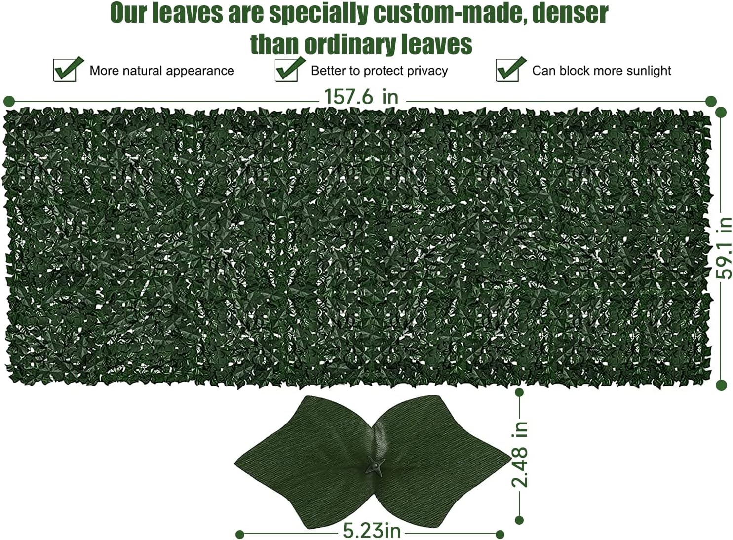 - 【Unique & Custom-made】 -- Our leaves are specially custom-made, denser than ordinary leaves, which unique vines can better to protect privacy. The size of the faux ivy privacy fence is: 158 X 60 inches.