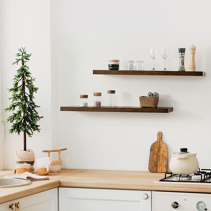 - Extra Deeper & Thicker for Storage - Each board measures 36"W x 8"D x 1.4"H. Extra deeper and thicker design in order to bring maximizes storage space and weight capacity, even hold up to 60 lb. This floating shelf taking up zero square feet, reduces clutter and highlights décor in compact spaces. It can help make full use of the empty wall, making it much more space-saving and making your room look larger and tidier.