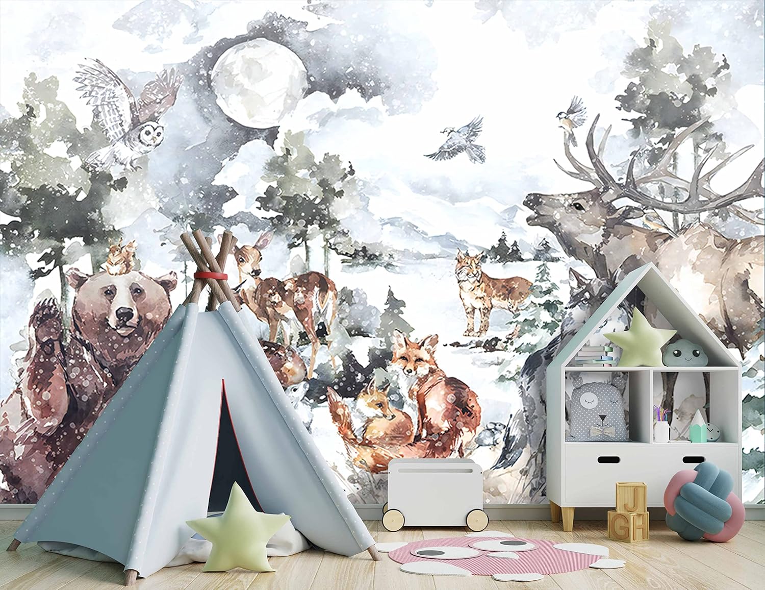Boys or Girls Cartoon Watercolor Animals wallpeper Nursery Kids Bedroom Wall Mural - 137"x96"(Not Peel and Stick)
