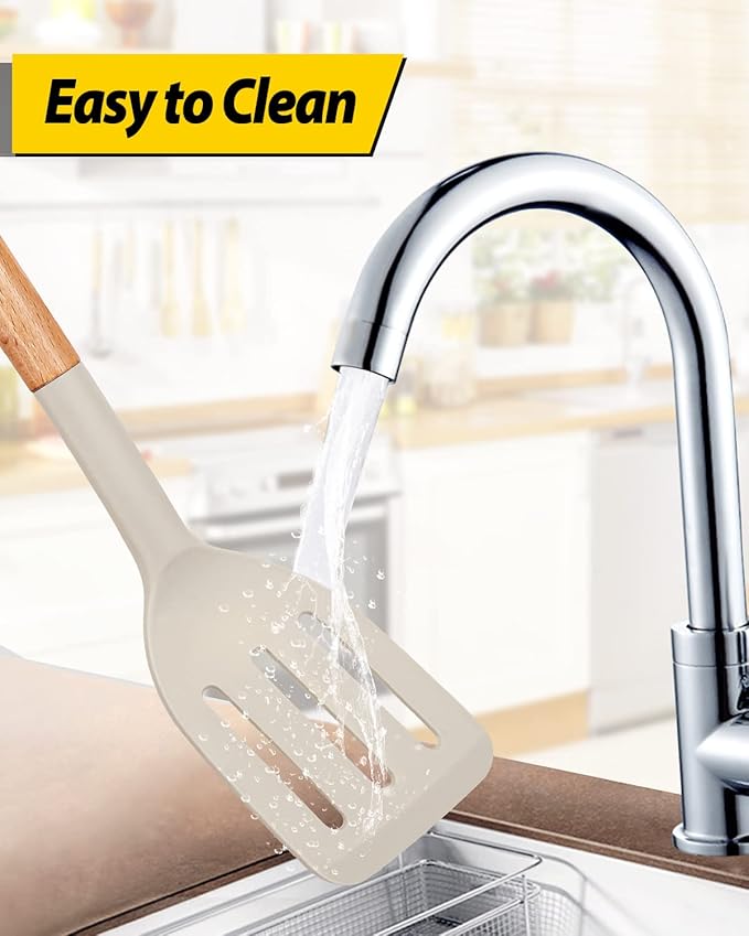 Pack of 2 Silicone Cooking Spatula, Heat Resistant Solid Turner, Non Stick Slotted Spatulas with Wooden Short Handle,Ideal Wood Kitchen Utensils Set for Frying, Baking, Flipping, Turning