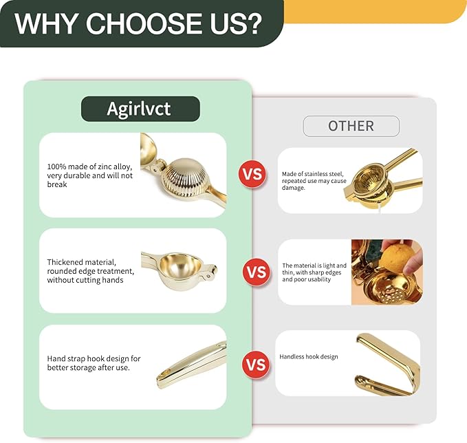 - Excellent Design of Lemon Press Handheld: The manual fruit juicer with gold color has an long handle that is easy to press. The thickened arc design at the front is stylish and exquisite. The screw groove design at the rear of lime squeezer stainless makes more convenient.