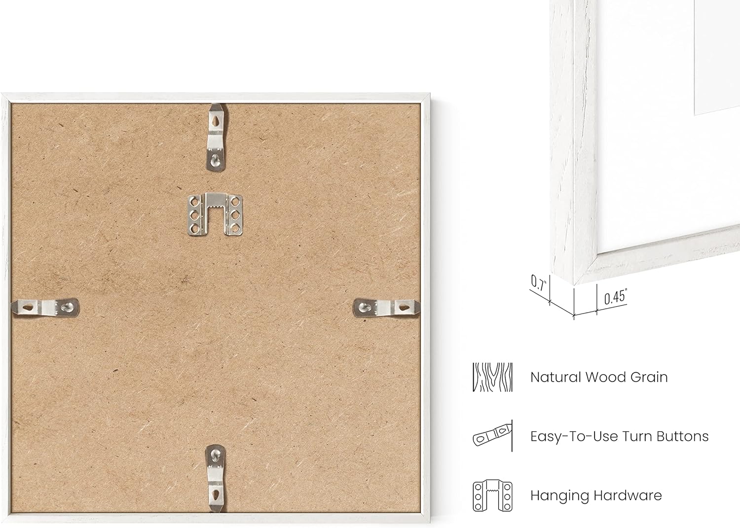 - WOODEN PICTURE FRAMES WHITE: Our 8 x 8 frame white wood set is meticulously constructed using natural oak wood, known for its timelessness and durability. The slim profile of the white frames gallery wall frame set effortlessly blends into any interior decor, adding a contemporary touch. The clean lines and sleek design make the 4 picture frame white poster frames with matting a perfect choice for those seeking a stylish, understated display solution