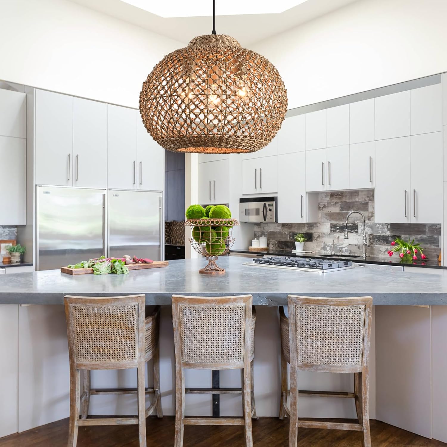 17" Rattan Pendant Light 3-Light Hand Woven Wicker Seagrass Hanging Light Boho Water Plants Rattan Chandelier for Dining Living Bedroom Kitchen Farmhouse