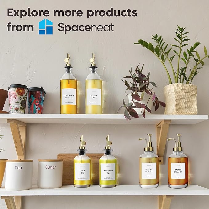 - Includes 55 Sticker Labels — Customize your glass oil dispenser thanks to the complimentary 55 waterproof and oil proof sticker labels made from PVC. Each label is minimalistic and clearly shows the contents of the bottle for convenience and decor.